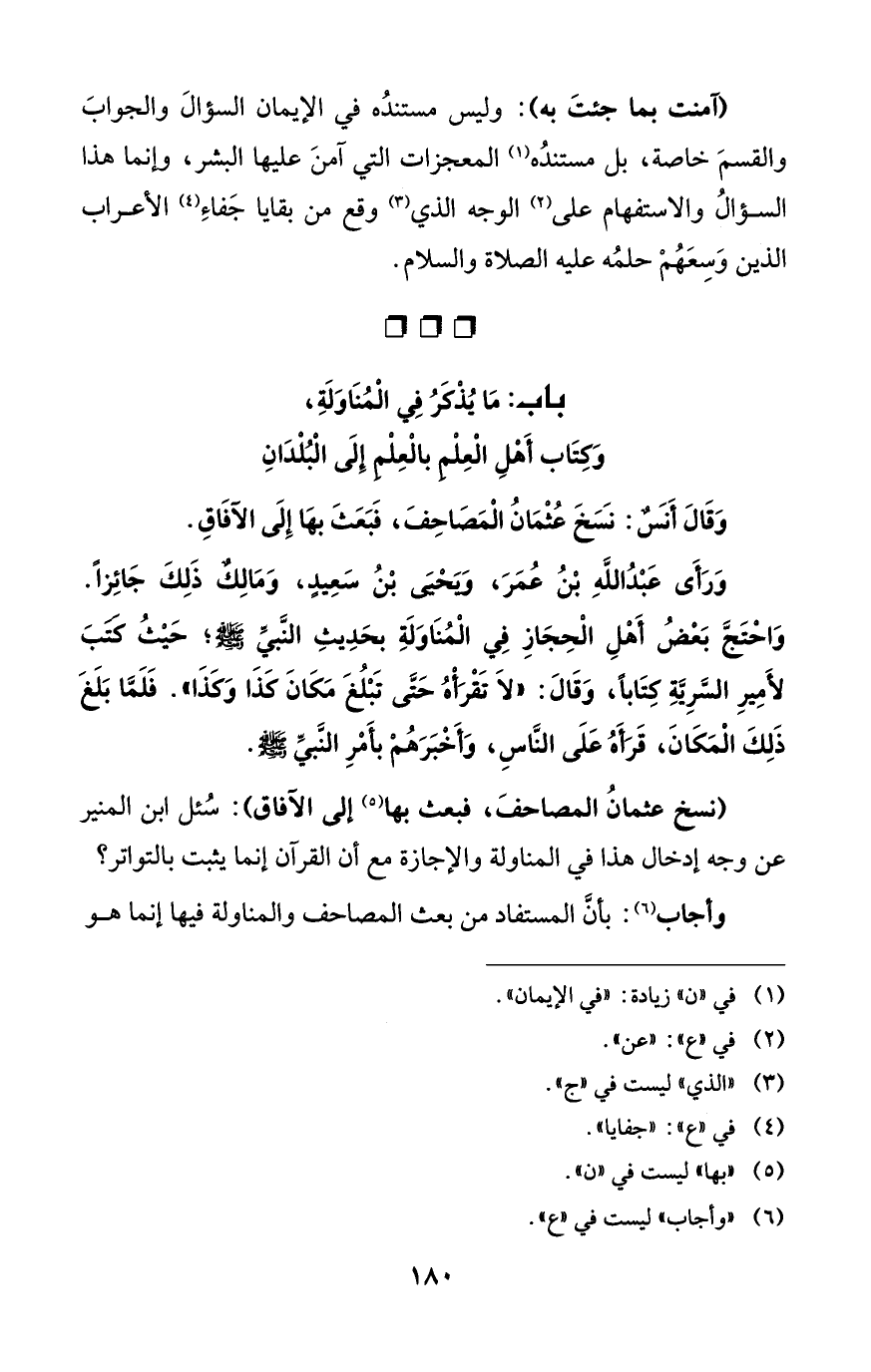 (نسخ عثمانُ المصاحفَ، فبعث بها (¬5) إلى الآفاق): سُئل ابن المنير عن وجه إدخال هذا في المناولة والإجازة مع أن القرآن إنما يثبت بالتواتر؟