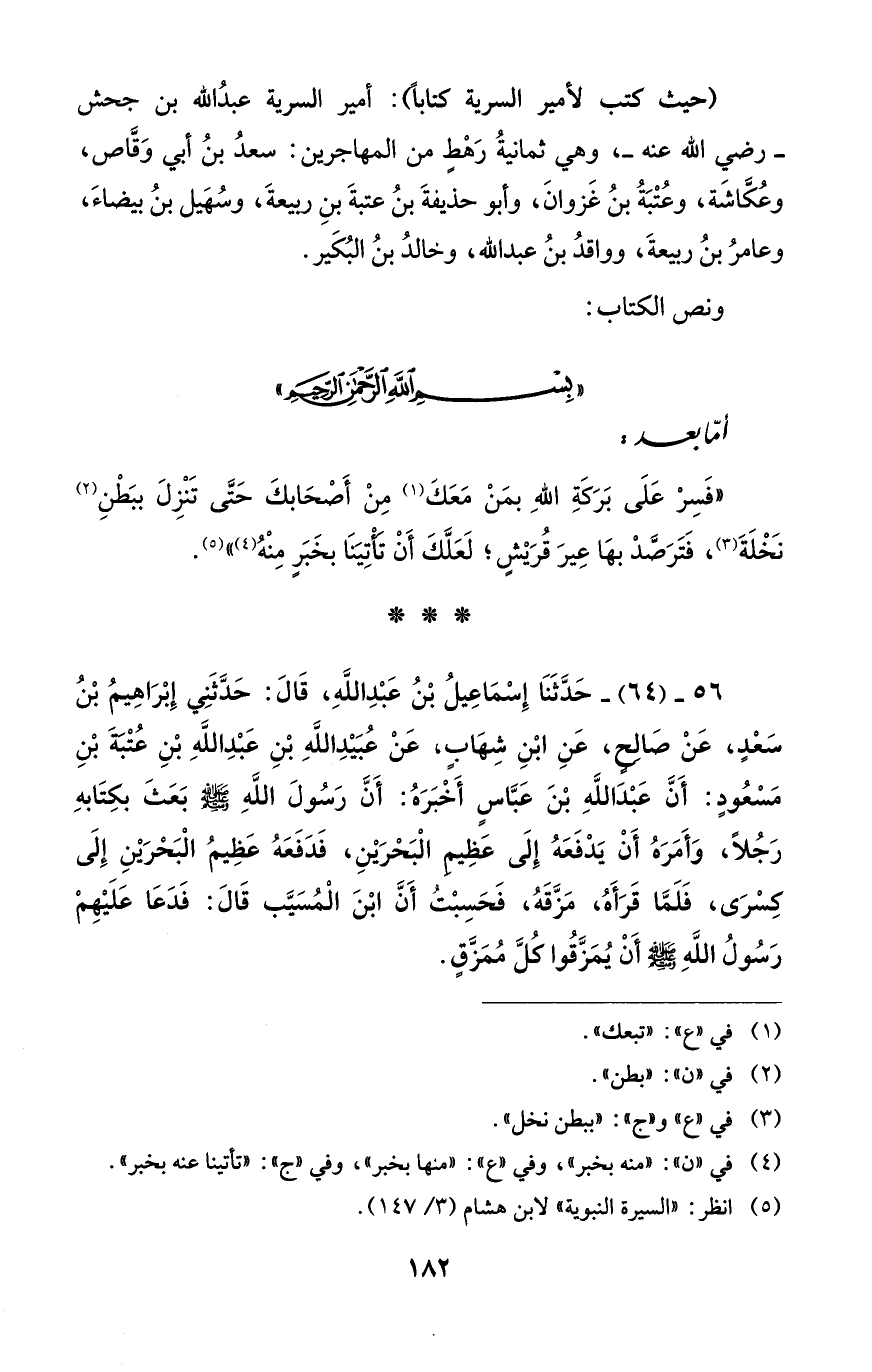 (حيث كتب لأمير السرية كتابًا): أمير السرية عبدُ الله بن جحش - رضي الله عنه -، وهي ثمانيةُ رَهْطٍ من المهاجرين: سعدُ بنُ أبي وَقَّاص، وعُكَّاشَة، وعُتْبَةُ بنُ غَزوانَ، وأبو حذيفةَ بنُ عتبةَ بنِ ربيعةَ، وسُهَيل بنُ بيضاءَ، وعامرُ بنُ ربيعةَ، وواقدُ بنُ عبد الله، وخالدُ بنُ البُكَير.