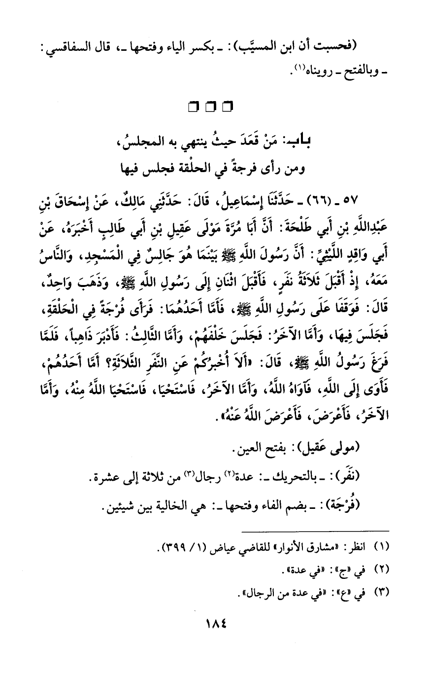 57 - (66) - حَدَّثَنَا إِسْمَاعِيلُ، قَالَ: حَدَّثَنِي مَالِكٌ، عَنْ إِسْحَاقَ بْنِ عَبْدِ اللَّهِ بْنِ أَبي طَلْحَةَ: أَنَّ أَبَا مُرَّةَ مَوْلَى عَقِيلِ بْنِ أَبي طَالِبٍ أَخْبَرَهُ، عَنْ أَبي وَاقِدٍ اللَّيْثِيِّ: أَنَّ رَسُولَ اللَّهِ - صلى الله عليه وسلم - بَيْنَمَا هُوَ جَالِسٌ فِي الْمَسْجِدِ، وَالنَّاسُ مَعَهُ، إِذْ أَقْبَلَ ثَلاَثَةُ نَفَرٍ، فَأَقْبَلَ اثْنَانِ إِلَى رَسُولِ اللَّهِ - صلى الله عليه وسلم -، وَذَهَبَ وَاحِدٌ، قَالَ: فَوَقَفَا عَلَى رَسُولِ اللَّهِ - صلى الله عليه وسلم -، فَأَمَّا أَحَدُهُمَا: فَرَأَى فُرْجَةً فِي الْحَلْقَةِ، فَجَلَسَ فِيهَا، وَأَمَّا الآخَرُ: فَجَلَسَ خَلْفَهُمْ، وَأَمَّا الثَّالِثُ: فَأَدْبَرَ ذَاهِبًا، فَلَمَّا فَرَغَ رَسُولُ اللَّهِ - صلى الله عليه وسلم -، قَالَ: "أَلاَ أُخْبرُكُمْ عَنِ النَّفَرِ الثَّلاَثَةِ؟ أَمَّا أَحَدُهُمْ، فَأَوَى إِلَى اللَّهِ، فَآوَاهُ اللَّهُ، وَأَمَّا الآخَرُ، فَاسْتَحْيَا، فَاسْتَحْيَا اللَّهُ مِنْهُ، وَأَمَّا الآخَرُ، فَأَعْرَضَ، فَأَعْرَضَ اللَّهُ عَنْهُ".