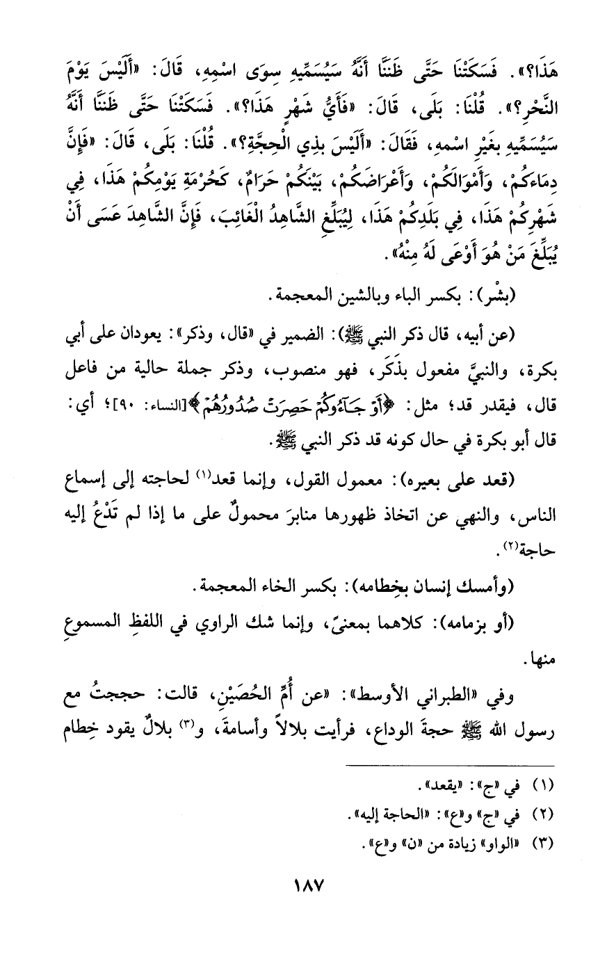 هَذَا؟ ". فَسَكَتْنَا حَتَّى ظَنَنَّا أَنَّهُ سَيُسَمِّيهِ سِوَى اسْمِهِ، قَالَ: "أَلَيْسَ يَوْمَ النَّحْرِ؟ ". قُلْنَا: بَلَى، قَالَ: "فَأَيُّ شَهْرٍ هَذَا؟ ". فَسَكَتْنَا حَتَّى ظَنَنَّا أَنَّهُ سَيُسَمِّيهِ بغَيْرِ اسْمهِ، فَقَالَ: "أَلَيْسَ بذِي الْحِجَّةِ؟ ". قُلْنَا: بَلَى، قَالَ: "فَإِنَّ دِمَاءَكُمْ، وَأَمْوَالَكُمْ، وَأَعْرَاضَكُمْ، بَيْنَكُمْ حَرَامٌ، كَحُرْمَةِ يَوْمِكُمْ هَذَا، فِي شَهْرِكُمْ هَذَا، فِي بَلَدِكُمْ هَذَا، لِيُبَلِّغِ الشَّاهِدُ الْغَائِبَ، فَإِنَّ الشَّاهِدَ عَسَى أَنْ يُبَلِّغَ مَنْ هُوَ أَوْعَى لَهُ مِنْهُ".