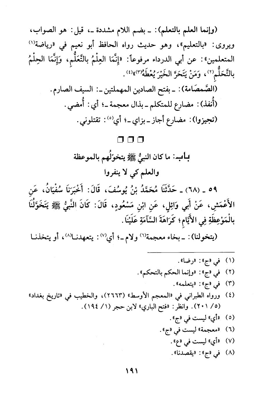 59 - (68) - حَدَّثَنَا مُحَمَّدُ بْنُ يُوسُفَ، قَالَ: أَخْبَرَناَ سُفْيَانُ، عَنِ الأَعْمَشِ، عَنْ أَبي وَائِلٍ، عَنِ ابْنِ مَسْعُودٍ، قَالَ: كَانَ النَّبيُّ - صلى الله عليه وسلم - يَتَخَوَّلُنَا بالْمَوْعِظَةِ فِي الأَيَّامِ؛ كَرَاهَةَ السَّآمَةِ عَلَيْنَا.