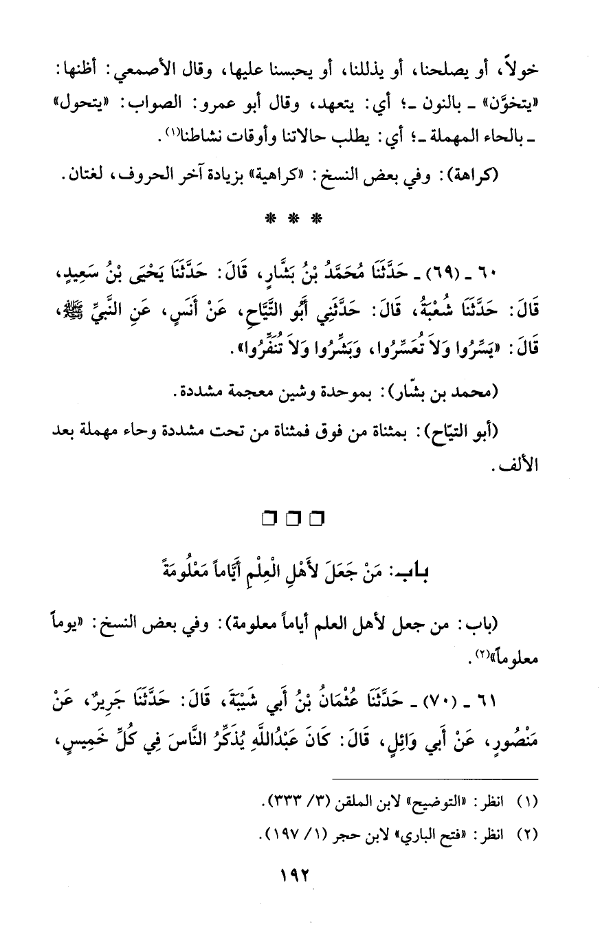 60 - (69) - حَدَّثَنَا مُحَمَّدُ بْنُ بَشَّارٍ، قَالَ: حَدَّثَنَا يَحْيَى بْنُ سَعِيدٍ، قَالَ: حَدَّثَنَا شُعْبَةُ، قَالَ: حَدَّثَنِي أَبُو التَّيَّاحِ، عَنْ أَنَسٍ، عَنِ النَّبيِّ - صلى الله عليه وسلم -، قَالَ: "يَسِّرُوا وَلاَ تُعَسِّرُوا، وَبَشِّرُوا وَلاَ تُنَفِّرُوا".