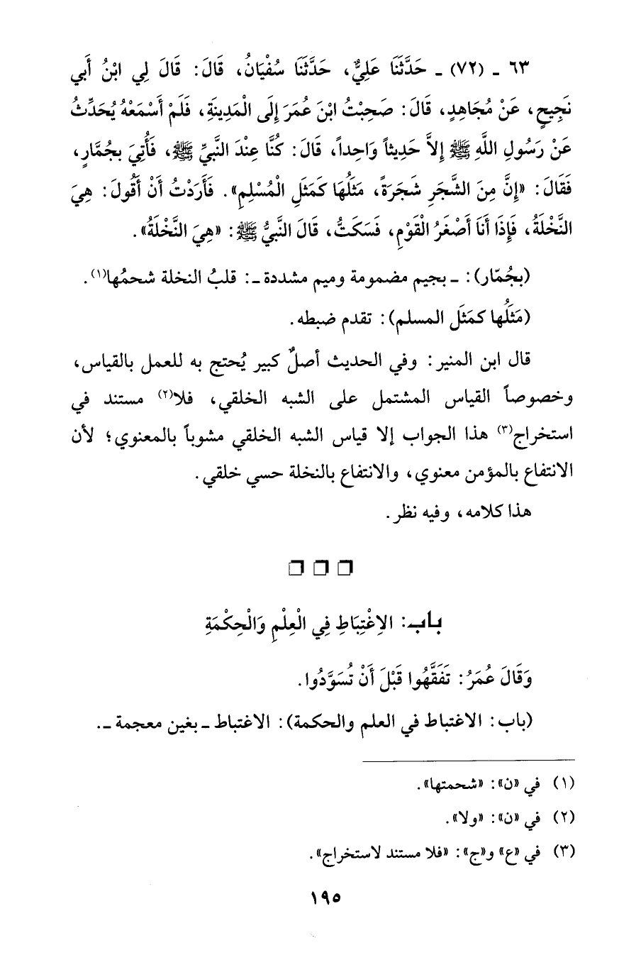 63 - (72) - حَدَّثَنَا عَلِيٌّ، حَدَّثَنَا سُفْيَانُ، قَالَ: قَالَ لِي ابْنُ أَبي نَجِيحٍ، عَنْ مُجَاهِدٍ، قَالَ: صَحِبْتُ ابْنَ عُمَرَ إِلَى الْمَدِينَةِ، فَلَمْ أَسْمَعْهُ يُحَدِّثُ عَنْ رَسُولِ اللَّهِ - صلى الله عليه وسلم - إِلَّا حَدِيثًا وَاحِدًا، قَالَ: كُنَّا عِنْدَ النَّبيِّ - صلى الله عليه وسلم -، فَأُتِيَ بجُمَّارٍ، فَقَالَ: "إِنَّ مِنَ الشَّجَرِ شَجَرَةً، مَثَلُهَا كمَثَلِ الْمُسْلِم". فَأَرَدْتُ أَنْ أَقُولَ: هِيَ النَّخْلَةُ، فَإِذَا أَناَ أَصْغَرُ الْقَوْمِ، فَسَكَتُّ، قَالَ النَّبيُّ - صلى الله عليه وسلم -: "هِيَ النَّخْلَةُ".