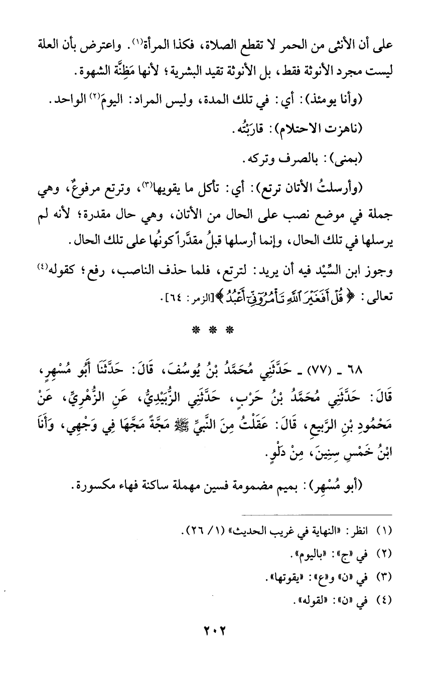 68 - (77) - حَدَّثَنِي مُحَمَّدُ بْنُ يُوسُفَ، قَالَ: حَدَّثَنَا أَبُو مُسْهِرٍ، قَالَ: حَدَّثَنِي مُحَمَّدُ بْنُ حَرْبٍ، حَدَّثَنِي الزُّبَيْدِيُّ، عَنِ الزُّهْرِيِّ، عَنْ مَحْمُودِ بْنِ الرَّبيعِ، قَالَ. عَقَلْتُ مِنَ النَّبيِّ - صلى الله عليه وسلم - مَجَّةً مَجَّهَا فِي وَجْهِي، وَأَنَا ابْنُ خَمْسِ سِنِينَ، مِنْ دَلْوٍ.