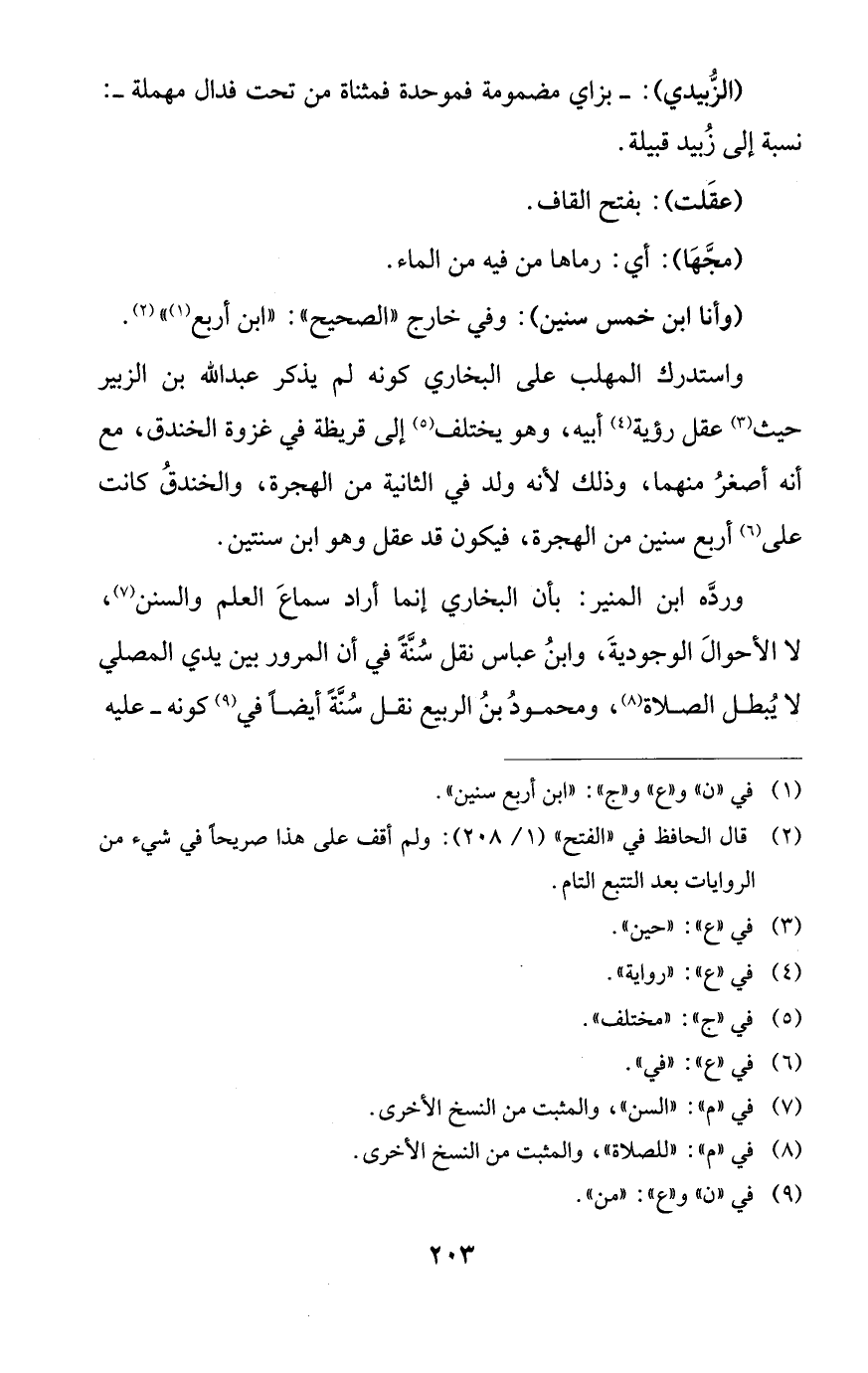 وردَّه ابن المنير: بأن البخاري إنما أراد سماعَ العلم والسنن (¬7)، لا الأحوالَ الوجوديةَ، وابنُ عباس نقل سُنَّةً في أن المرور بين يدي المصلي لا يُبطل الصلاة (¬8)، ومحمودُ بنُ الربيع نقل سُنَّةً أيضًا في (¬9) كونه - عليه
