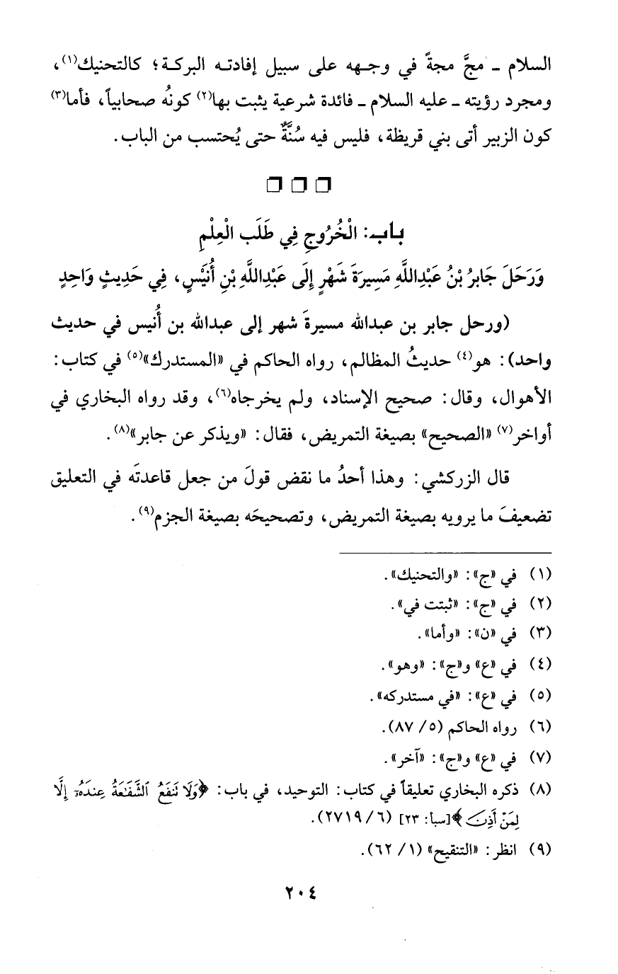 وَرَحَلَ جَابرُ بْنُ عَبْدِ اللَّهِ مَسِيرَةَ شَهْرٍ إِلَى عَبْدِ اللَّهِ بْنِ أُنَيْسٍ، فِي حَدِيثٍ وَاحِدٍ (ورحل جابر بن عبد الله مسيرةَ شهر إلى عبد الله بن أُنيس في حديث واحد): هو (¬4) حديثُ المظالم، رواه الحاكم في "المستدرك" (¬5) في كتاب: الأهوال، وقال: صحيح الإسناد، ولم يخرجاه (¬6)، وقد رواه البخاري في أواخر (¬7) "الصحيح" بصيغة التمريض، فقال: "ويذكر عن جابر" (¬8).