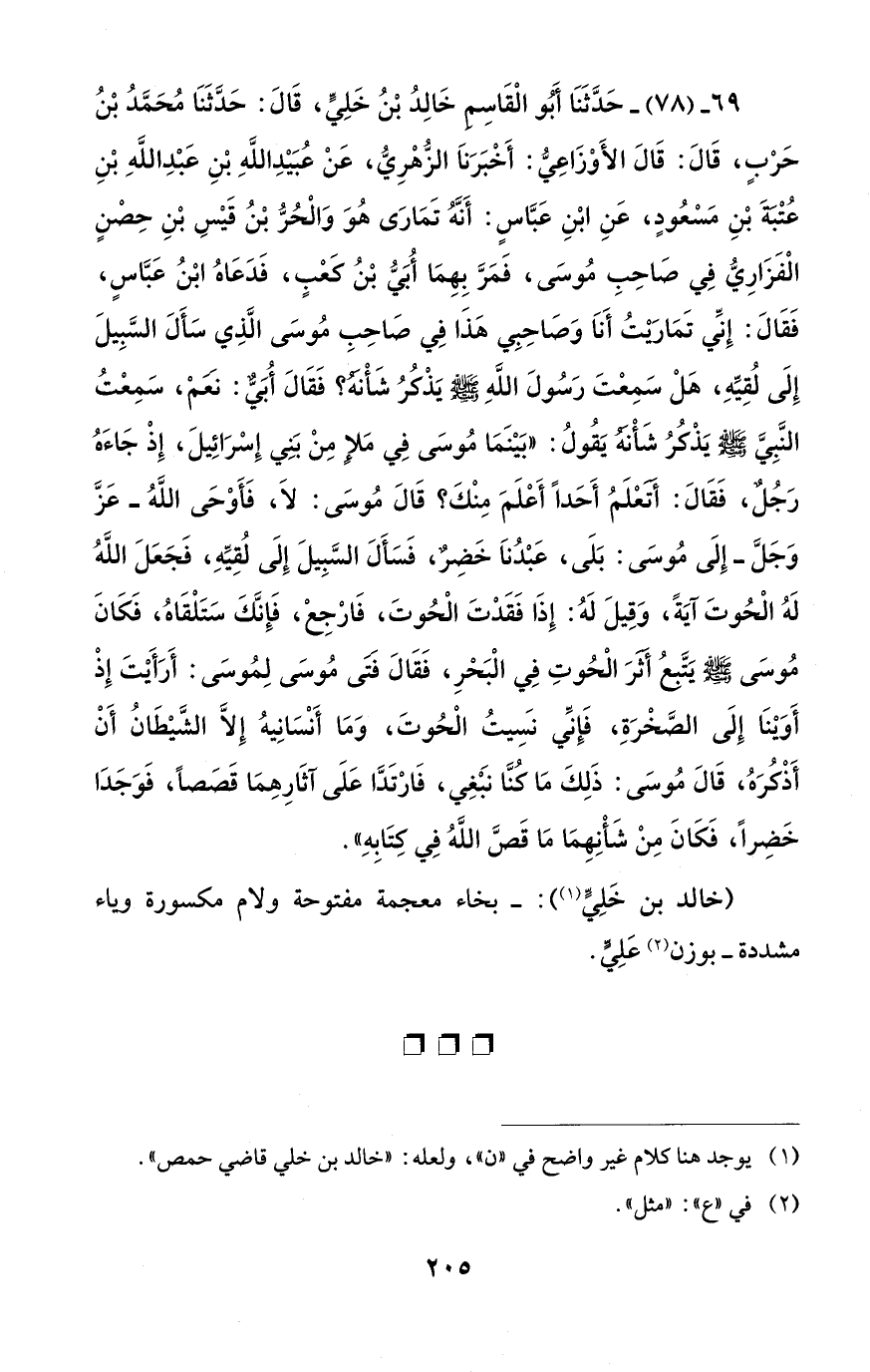 69 - (78) - حَدَّثَنَا أَبُو الْقَاسِمِ خَالِدُ بْنُ خَلِيٍّ، قَالَ: حَدَّثَنَا مُحَمَّدُ بْنُ حَرْبٍ، قَالَ: قَالَ الأَوْزَاعِيُّ: أَخْبَرَنَا الزُّهْرِيُّ، عَنْ عُبَيْدِ اللَّهِ بْنِ عَبْدِ اللَّهِ بْنِ عُتْبَةَ بْنِ مَسْعُودٍ، عَنِ ابْنِ عَبَّاسٍ: أَنَّهُ تَمَارَى هُوَ وَالْحُرُّ بْنُ قَيْسِ بْنِ حِصْنٍ الْفَزَارِيُّ فِي صَاحِبِ مُوسَى، فَمَرَّ بِهِمَا أُبَيُّ بْنُ كَعْبٍ، فَدَعَاهُ ابْنُ عَبَّاسٍ، فَقَالَ: إِنِّي تَمَارَيْتُ أَنَا وَصَاحِبِي هَذَا فِي صَاحِبِ مُوسَى الَّذِي سَأَلَ السَّبِيلَ إِلَى لُقِيِّهِ، هَلْ سَمِعْتَ رَسُولَ اللَّهِ - صلى الله عليه وسلم - يَذْكُرُ شَأْنَهُ؟ فَقَالَ أُبَيٌّ: نَعَمْ، سَمِعْتُ النَّبِيَّ - صلى الله عليه وسلم - يَذْكُرُ شَأْنَهُ يَقُولُ: "بَيْنَمَا مُوسَى فِي مَلإٍ مِنْ بَنِي إِسْرَائِيلَ، إِذْ جَاءَهُ رَجُلٌ، فَقَالَ: أَتَعْلَمُ أَحَدًا أَعْلَمَ مِنْكَ؟ قَالَ مُوسَى: لاَ، فَأَوْحَى اللَّهُ - عَزَّ وَجَلَّ - إِلَى مُوسَى: بَلَى، عَبْدُنَا خَضِرٌ، فَسَأَلَ السَّبِيلَ إِلَى لُقِيَّهِ، فَجَعَلَ اللَّهُ لَهُ الْحُوتَ آيَةً، وَقِيلَ لَهُ: إِذَا فَقَدْتَ الْحُوتَ، فَارْجِعْ، فَإِنَّكَ سَتَلْقَاهُ، فَكَانَ مُوسَى - صلى الله عليه وسلم - يَتَّبِعُ أَثَرَ الْحُوتِ فِي الْبَحْرِ، فَقَالَ فَتَى مُوسَى لِمُوسَى: أَرَأَيْتَ إِذْ أَوَيْنَا إِلَى الصَّخْرَةِ، فَإِنِّي نَسِيتُ الْحُوتَ، وَمَا أَنْسَانِيهُ إِلَّا الشَّيْطَانُ أَنْ أَذْكُرَهُ، قَالَ مُوسَى: ذَلِكَ مَا كُنَّا نَبْغِي، فَارْتَدَّا عَلَى آثَارِهِمَا قَصَصًا، فَوَجَدَا خَضِرًا، فَكَانَ مِنْ شَأْنِهِمَا مَا قَصَّ اللَّهُ فِي كِتَابِهِ".