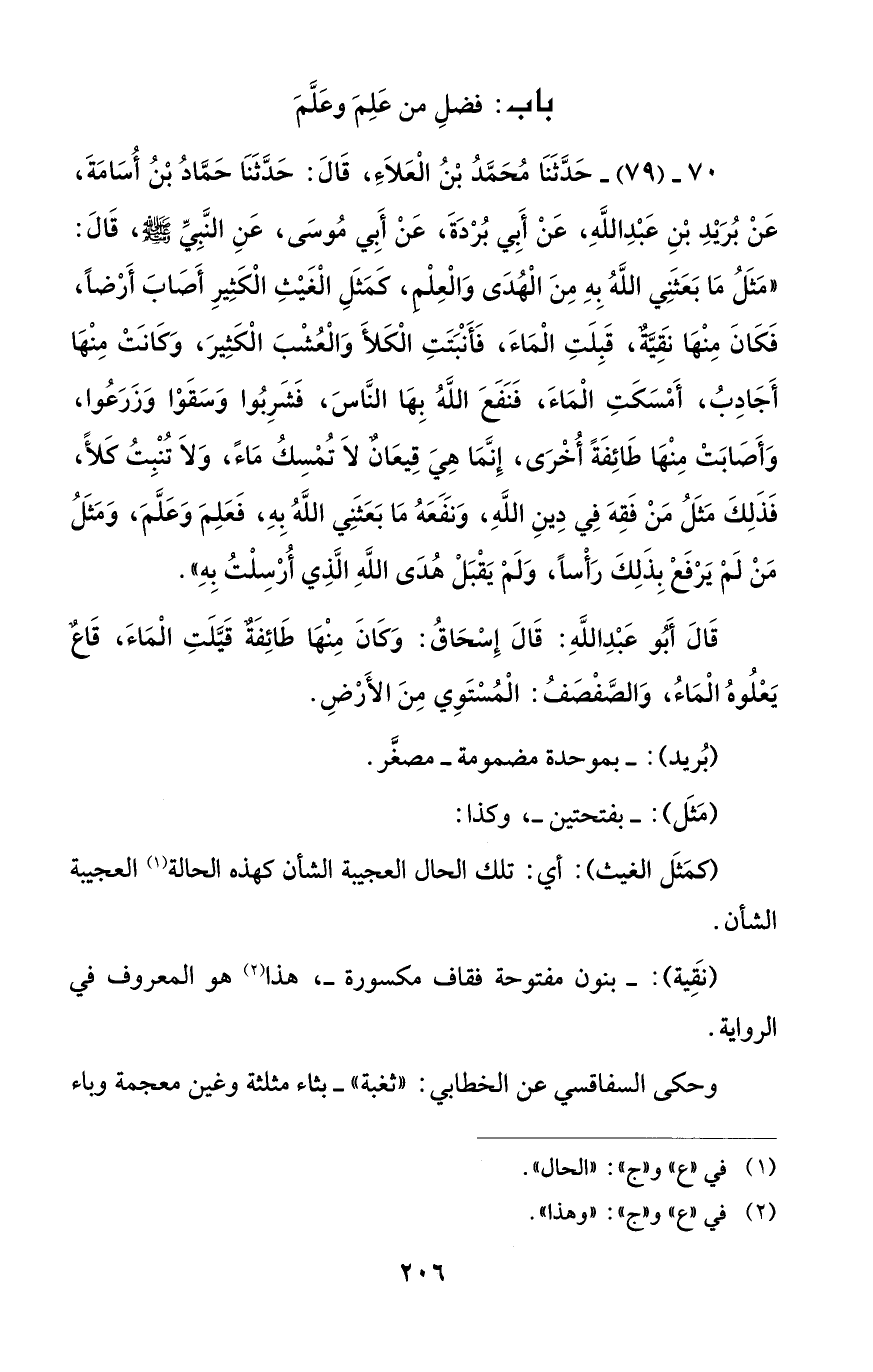 70 - (79) - حَدَّثَنَا مُحَمَّدُ بْنُ الْعَلاَءِ، قَالَ: حَدَّثَنَا حَمَّادُ بْنُ أُسَامَةَ، عَنْ بُرَيْدِ بْنِ عَبْدِ اللَّهِ، عَنْ أَبِي بُرْدَةَ، عَنْ أَبِي مُوسَى، عَنِ النَّبِيِّ - صلى الله عليه وسلم -، قَالَ: "مَثَلُ مَا بَعَثَنِي اللَّهُ بِهِ مِنَ الْهُدَى وَالْعِلْمِ، كَمَثَلِ الْغَيْثِ الْكَثِيرِ أَصَابَ أَرْضًا، فَكَانَ مِنْهَا نَقِيَّةٌ، قَبِلَتِ الْمَاءَ، فَأَنْبَتَتِ الْكَلأَ وَالْعُشْبَ الْكَثِيرَ، وَكَانَتْ مِنْهَا أَجَادِبُ، أَمْسَكَتِ الْمَاءَ، فَنَفَعَ اللَّهُ بِهَا النَّاسَ، فَشَرِبُوا وَسَقَوْا وَزَرَعُوا، وَأَصَابَتْ مِنْهَا طَائِفَةً أُخْرَى، إِنَّمَا هِيَ قِيعَانٌ لاَ تُمْسِكُ مَاءً، وَلاَ تُنْبِتُ كَلأً، فَذَلِكَ مَثَلُ مَنْ فَقِهَ فِي دِينِ اللَّهِ، وَنَفَعَهُ مَا بَعَثَنِي اللَّهُ بِهِ، فَعَلِمَ وَعَلَّمَ، وَمَثَلُ مَنْ لَمْ يَرْفَعْ بِذَلِكَ رَأْسًا، وَلَمْ يَقْبَلْ هُدَى اللَّهِ الَّذِي أُرْسِلْتُ بِهِ".