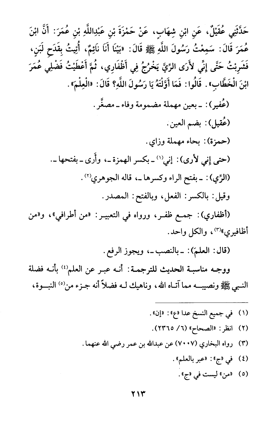 حَدَّثَنِي عُقَيْلٌ، عَنِ ابْنِ شِهَابٍ، عَنْ حَمْزَةَ بْنِ عَبْدِ اللَّهِ بْنِ عُمَرَ: أَنَّ ابْنَ عُمَرَ قَالَ: سَمِعْتُ رَسُولَ اللَّهِ - صلى الله عليه وسلم - قَالَ: "بَيْنَا أَناَ ناَئِمٌ، أُتِيتُ بِقَدَحِ لَبَنٍ، فَشَرِبْتُ حَتَّى إنِّي لأَرَى الرِّيَّ يَخْرُجُ فِي أَظْفَارِي، ثُمَّ أَعْطَيْتُ فَضْلِي عُمَرَ ابْنَ الْخَطَّابِ". قَالُوا: فَمَا أَوَّلْتَهُ يَا رَسُولَ اللَّهِ؟ قَالَ: "الْعِلْمَ".