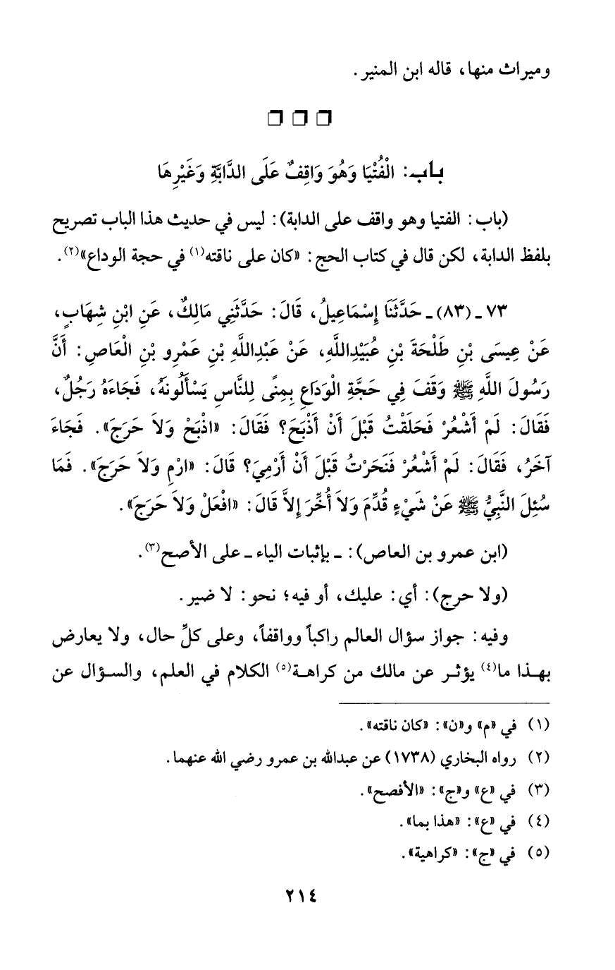 73 - (83) - حَدَّثَنَا إِسْمَاعِيلُ، قَالَ: حَدَّثَنِي مَالِكٌ، عَنِ ابْنِ شِهَابٍ، عَنْ عِيسَى بْنِ طَلْحَةَ بْنِ عُبَيْدِ اللَّهِ، عَنْ عَبْدِ اللَّهِ بْنِ عَمْرِو بْنِ الْعَاصِ: أَنَّ رَسُولَ اللَّهِ - صلى الله عليه وسلم - وَقَفَ فِي حَجَّةِ الْوَداعِ بِمِنًى لِلنَّاسِ يَسْألونه، فَجَاءَهُ رَجُلٌ، فَقَالَ: لَمْ أَشْعُرْ فَحَلَقْتُ قَبْلَ أَنْ أَذْبَحَ؟ فَقَالَ: "اذْبَحْ وَلاَ حَرَجَ". فَجَاءَ آخَرُ، فَقَالَ: لَمْ أَشْعُرْ فَنَحَرْتُ قَبْلَ أَنْ أَرْمِيَ؟ قَالَ: "ارْمِ وَلاَ حَرَجَ". فَمَا سُئِلَ النَّبِيُّ - صلى الله عليه وسلم - عَنْ شَيْءٍ قُدِّمَ وَلاَ أُخِّرَ إلَّا قَالَ: "افْعَلْ وَلاَ حَرَجَ".