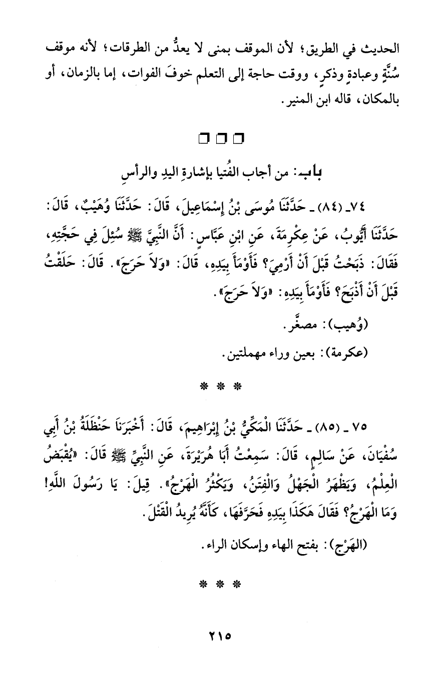 75 - (85) - حَدَّثَنَا الْمَكِّيُّ بْنُ إِبْرَاهِيمَ، قَالَ: أَخْبَرَناَ حَنْظَلَةُ بْنُ أَبي سُفْيَانَ، عَنْ سَالِم، قَالَ: سَمِعْتُ أَبَا هُرَيْرَةَ، عَنِ النَّبِيِّ - صلى الله عليه وسلم - قَالَ: "يُقْبَضُ الْعِلْمُ، وَيَظْهَرُ الْجَهْلُ وَالْفِتَنُ، وَيَكْثُرُ الْهَرْجُ". قِيلَ: يَا رَسُولَ اللَّهِ! وَمَا الْهَرْجُ؟ فَقَالَ هَكَذَا بِيَدِهِ فَحَرَّفَهَا، كَأَنَّهُ يُرِيدُ الْقَتْلَ.