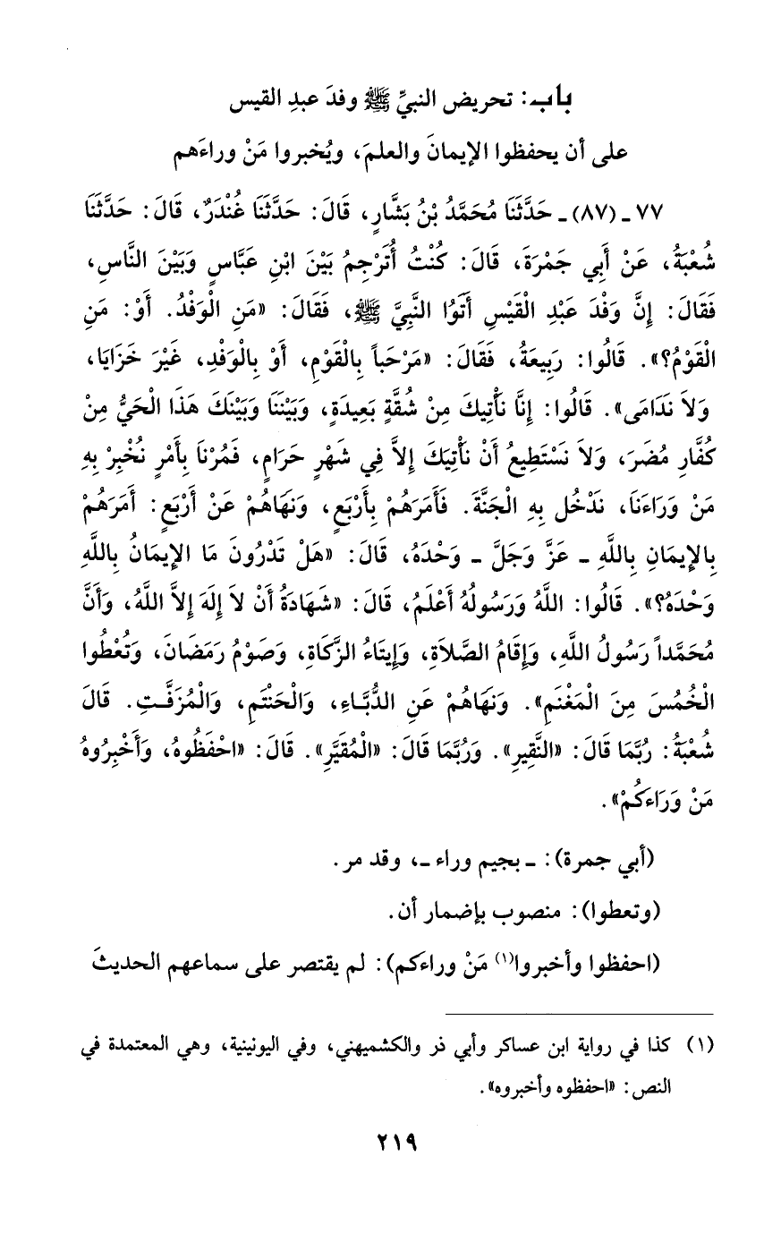 77 - (87) - حَدَّثَنَا مُحَمَّدُ بْنُ بَشَّارٍ، قَالَ: حَدَّثَنَا غُنْدَرٌ، قَالَ: حَدَّثَنَا شُعْبَةُ، عَنْ أَبي جَمْرَةَ، قَالَ: كُنْتُ أُتَرْجِمُ بَيْنَ ابْنِ عَبَّاسٍ وَبَيْنَ النَّاسِ، فَقَالَ: إِنَّ وَفْدَ عَبْدِ الْقَيْسِ أتوُا النَّبِيَّ - صلى الله عليه وسلم -، فَقَالَ: "مَنِ الْوَفْدُ. أَوْ: مَنِ الْقَوْمُ؟ ". قَالُوا: رَبِيعَةُ، فَقَالَ: "مَرْحَبًا بِالْقَوْمِ، أَوْ بِالْوَفْدِ، غَيْرَ خَزَايَا، وَلاَ نَدَامَى". قَالُوا: إِنَّا نأتِيكَ مِنْ شُقَّةٍ بَعِيدَةٍ، وَبَيْنَنَا وَبَيْنَكَ هَذَا الْحَيُّ مِنْ كفَّارِ مُضَرَ، وَلاَ نستَطِيعُ أَنْ نأتِيَكَ إلَّا فِي شَهْرٍ حَرَامٍ، فَمُرْناَ بِأَمْرٍ نُخْبِرْ بِهِ مَنْ وَرَاءَناَ، نَدْخُل بِهِ الْجَنَّةَ. فَأَمَرَهُمْ بِأَرْبَعٍ، وَنهاهُمْ عَنْ أَرْبَعٍ: أَمَرَهُمْ بِالإيمَانِ بِاللَّهِ -عَزَّ وَجَلَّ- وَحْدَهُ، قَالَ: "هَلْ تَدْرُونَ مَا الإيمَانُ بِاللَّهِ وَحْده؟ ". قَالُوا: اللَّهُ وَرَسُولُهُ أَعْلَمُ، قَالَ: "شَهَادَةُ أَنْ لاَ إِلَهَ إلَّا اللَّهُ، وَأَنَّ مُحَمَّدًا رَسُولُ اللَّهِ، وَإِقَامُ الصَّلاَةِ، وَإِيتَاءُ الزكاة، وَصَوْمُ رَمَضَانَ، وَتُعْطُوا الْخُمُسَ مِنَ الْمَغْنَم". وَنهاهُمْ عَنِ الدُّبَّاءِ، وَالْحَنْتَم، وَالْمُزَفَّتِ. قَالَ شُعْبَةُ: رُبَّمَا قَالَ: "النَّقِيرِ". وَرُبَّمَا قَالَ: "الْمُقَيَّرِ". قَالَ: "احْفَظُوهُ، وَأَخْبِرُوهُ مَنْ وَرَاءكُمْ".
