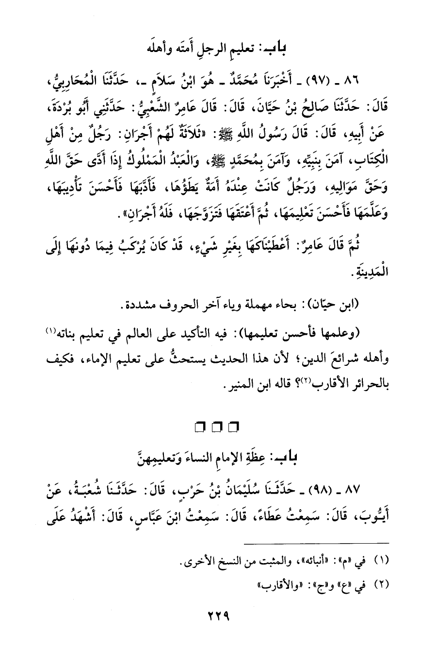 86 - (97) - أَخْبَرَناَ مُحَمَّد -هُوَ ابْنُ سَلاَمٍ-، حَدَّثَنَا الْمُحَارِبِيُّ، قَالَ: حَدَّثَنَا صَالح بْنُ حَيَّانَ، قَالَ: قَالَ عَامِرٌ الشَّعْبِيُّ: حَدَّثَنِي أَبُو بُرْدَةَ، عَنْ أَبيهِ، قَالَ: قَالَ رَسُولُ اللَّهِ - صلى الله عليه وسلم -: "ثَلاَثةٌ لَهُمْ أَجْرَانِ: رَجُلٌ مِنْ أَهْلِ الْكِتَابِ، آمَنَ بِنَبِيِّهِ، وَآمَنَ بِمُحَمَّدٍ - صلى الله عليه وسلم -، وَالْعَبْدُ الْمَمْلُوكُ إِذَا أَدَّى حَقَّ اللَّهِ وَحَقَّ مَوَالِيهِ، وَرَجُلٌ كانَتْ عِنْدَهُ أَمَةٌ يَطَؤُهَا، فَأَدَّبَهَا فَأحْسَنَ تَأْدِيبَهَا، وَعَلَّمَهَا فَأَحْسَنَ تَعْلِيمَهَا، ثُمَّ أَعْتَقَهَا فتزَوَّجَهَا، فَلَهُ أَجْرَانِ".