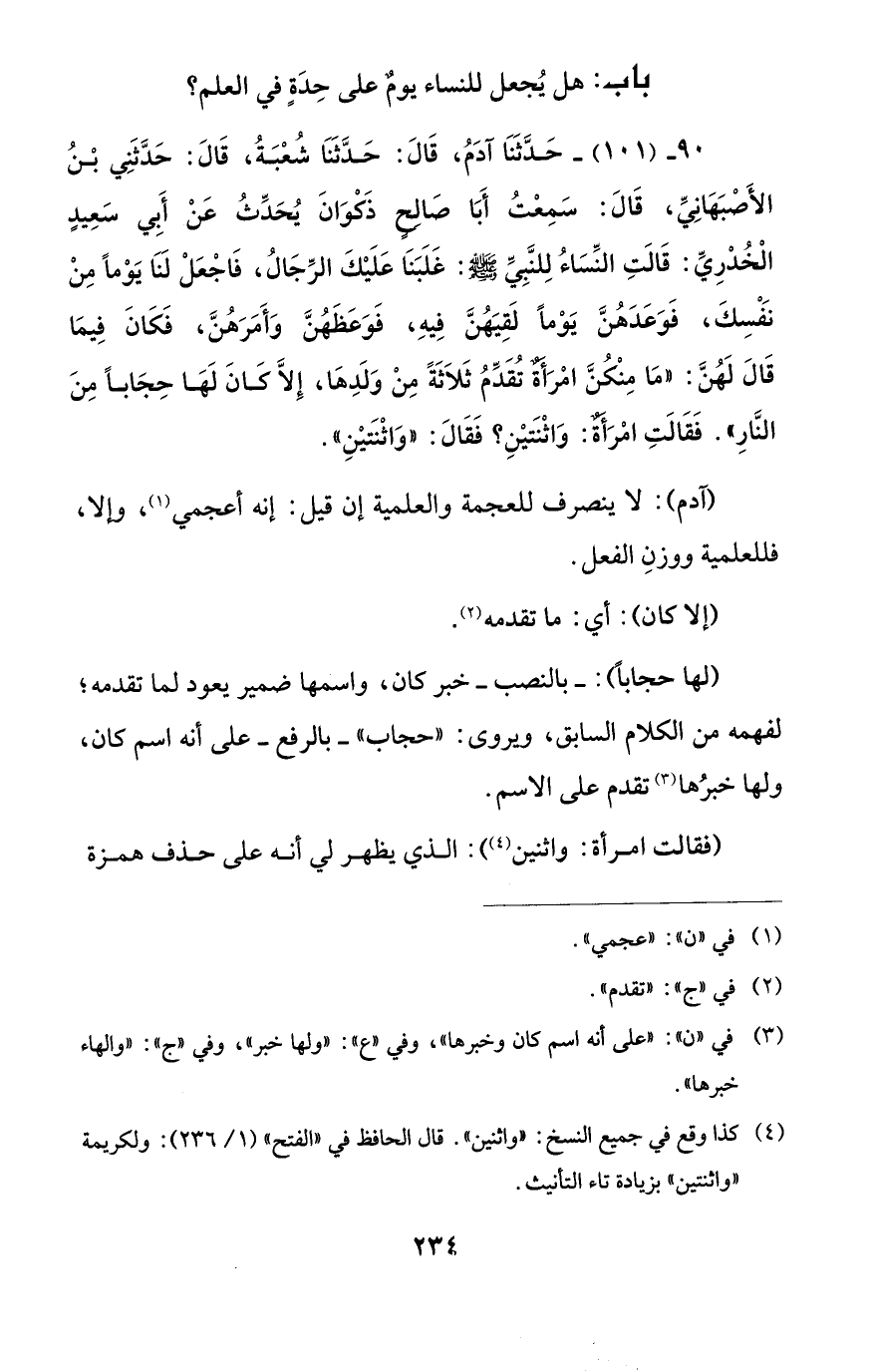 90 - (101) - حَدَّثَنَا آدَمُ، قَالَ: حَدَّثَنَا شُعْبَةُ، قَالَ: حَدَّثَنِي بْنُ الأَصْبَهَانِيِّ، قَالَ: سَمِعْتُ أَبَا صَالحٍ ذَكوَانَ يُحَدِّثُ عَنْ أَبي سَعِيدٍ الْخُدْرِيِّ: قَالَتِ النِّسَاءُ لِلنَّبِيِّ - صلى الله عليه وسلم -: غَلَبَنَا عَلَيْكَ الرِّجَالُ، فَاجْعَلْ لَنَا يَوْمًا مِنْ نَفْسِكَ، فَوَعَدَهُنَّ يَوْمًا لَقِيَهُنَّ فِيهِ، فَوَعَظَهُنَّ وَأَمَرَهُنَّ، فَكَانَ فِيمَا قَالَ لَهُنَّ: "مَا مِنْكُنَّ امْرَأةٌ تُقَدِّمُ ثَلاَثَةً مِنْ وَلَدِهَا، إلَّا كَانَ لَهَا حِجَابًا مِنَ النَّارِ". فَقَالَتِ امْرَأةٌ: وَاثْنَتيْنِ؟ فَقَالَ: "وَاثْنَتيْنِ".
