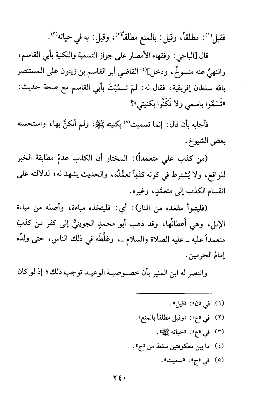 (فليتبوأ مقعده من النار): أي: فليتخذه مباءة، وأصله من مباءة الإبل، وهي أَعطانُها، وقد ذهب أبو محمدٍ الجوينيُّ إلى كفر من كذبَ متعمدًا عليه -عليه الصلاة والسلام-، وغلَّطَه في ذلك الناس، حتى ولدُه إمامُ الحرمين.