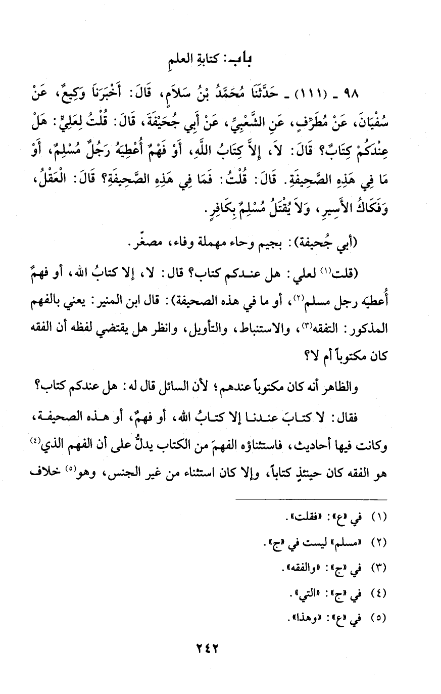 98 - (111) - حَدَّثَنَا مُحَمَّدُ بْنُ سَلاَمٍ، قَالَ: أَخْبَرَنَا وَكيعٌ، عَنْ سُفْيَانَ، عَنْ مُطَرِّفٍ، عَنِ الشَّعْبِيِّ، عَنْ أَبي جُحَيْفَةَ، قَالَ: قُلْتُ لِعَلِيٍّ: هَلْ عِنْدكمْ كتَابٌ؟ قَالَ: لاَ، إلَّا كِتَابُ اللَّهِ، أَوْ فَهْمٌ أُعْطِيَهُ رَجُل مُسْلِمٌ، أَوْ مَا فِي هَذه الصَّحِيفَةِ. قَالَ: قُلْتُ: فَمَا فِي هَذه الصَّحِيفَةِ؟ قَالَ: الْعَقْلُ، وَفَكَاكُ الأَسِيرِ، وَلاَ يُقْتَلُ مُسْلِمٌ بِكَافِرٍ.