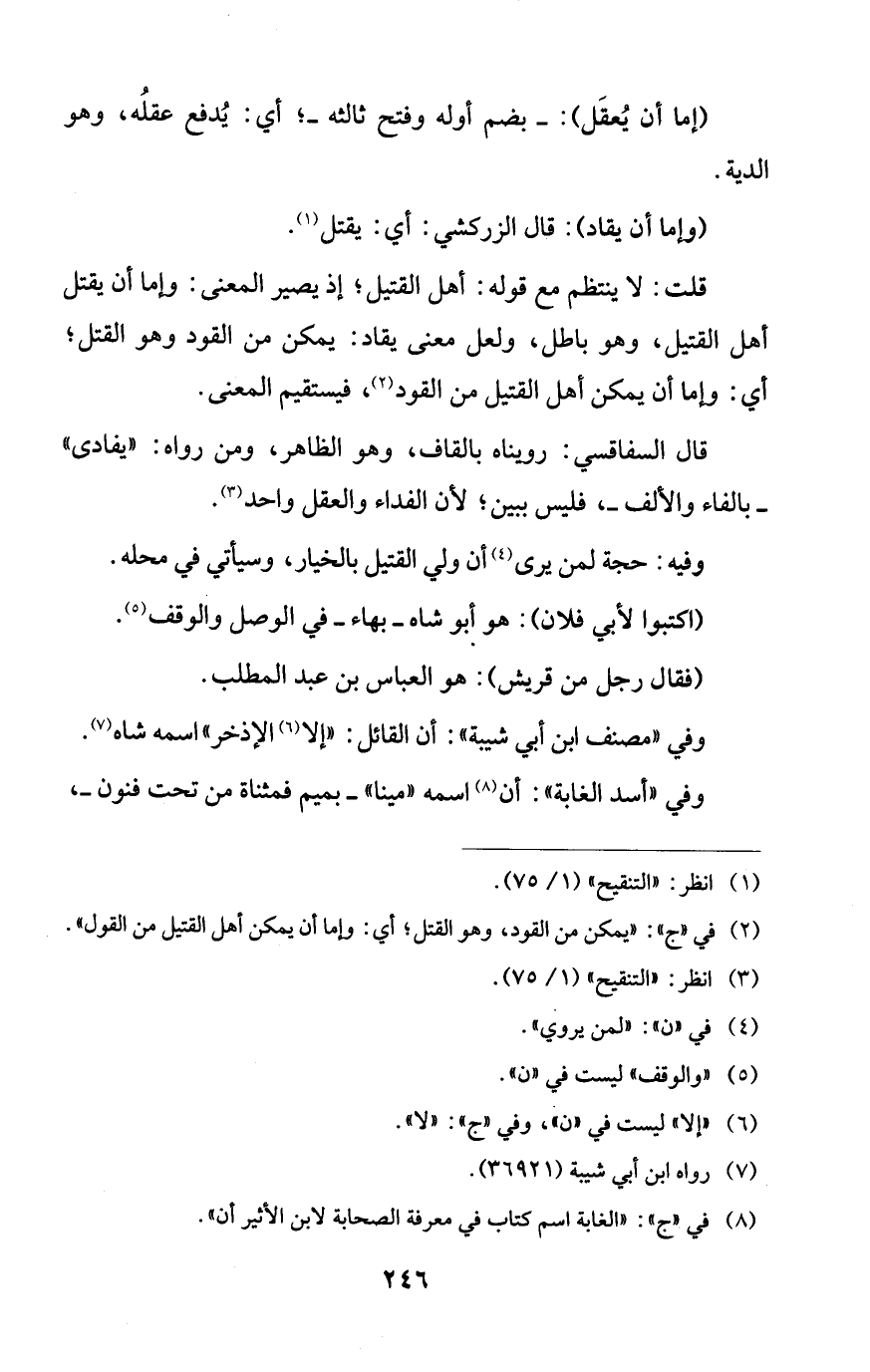 قال السفاقسي: رويناه بالقاف، وهو الظاهر، ومن رواه: "يفادى" -بالفاء والألف-، فليس ببين؛ لأن الفداء والعقل واحد (¬3).