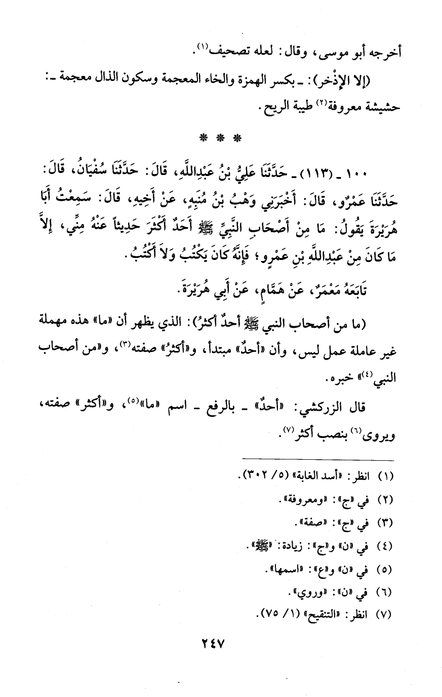100 - (113) - حَدَّثَنَا عَلِيُّ بْنُ عَبْدِ اللَّهِ، قَالَ: حَدَّثَنَا سُفْيَانُ، قَالَ: حَدَّثَنَا عَمْرٌو، قَالَ: أَخْبَرَنِي وَهْبُ بْنُ مُنَبِهٍ، عَنْ أَخِيهِ، قَالَ: سَمِعْتُ أَبَا هُرَيْرَةَ يَقُولُ: مَا مِنْ أَصْحَابِ النَّبِيِّ - صلى الله عليه وسلم - أَحَدٌ أكثَرَ حَدِيثًا عَنْهُ مِنِّي، إلَّا مَا كَانَ مِنْ عَبْدِ اللَّهِ بْنِ عَمْرٍو؛ فَإِنَّهُ كَانَ يَكْتُبُ وَلاَ أكتُبُ.