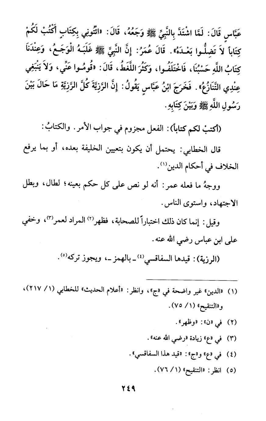 عَبَّاسٍ قَالَ: لَمَّا اشْتَدَّ بِالنَّبِيِّ - صلى الله عليه وسلم - وَجَعُهُ، قَالَ: "ائتوني بِكِتَابٍ أكتُبْ لَكُمْ كِتَابًا لاَ تَضِلُّوا بَعْدَه". قَالَ عُمَرُ: إنَّ النَّبِيَّ - صلى الله عليه وسلم - غلَبَهُ الْوَجَعُ، وَعِنْدَناَ كتَابُ اللَّهِ حَسْبُنَا، فَاخْتَلَفُوا، وَكَثُرَ اللَّغَطُ، قَالَ: "قُومُوا عَنِّي، وَلاَ يَنْبَغِي عِنْدِي التَّنَازُعُ". فَخَرَجَ ابْنُ عَبَّاسٍ يَقُولُ: إِنَّ الرَّزَّيةَ كُلَّ الرَّزِيَّةِ مَا حَالَ بَيْنَ رَسُولِ اللَّهِ - صلى الله عليه وسلم - وَبَيْنَ كتَابِهِ.