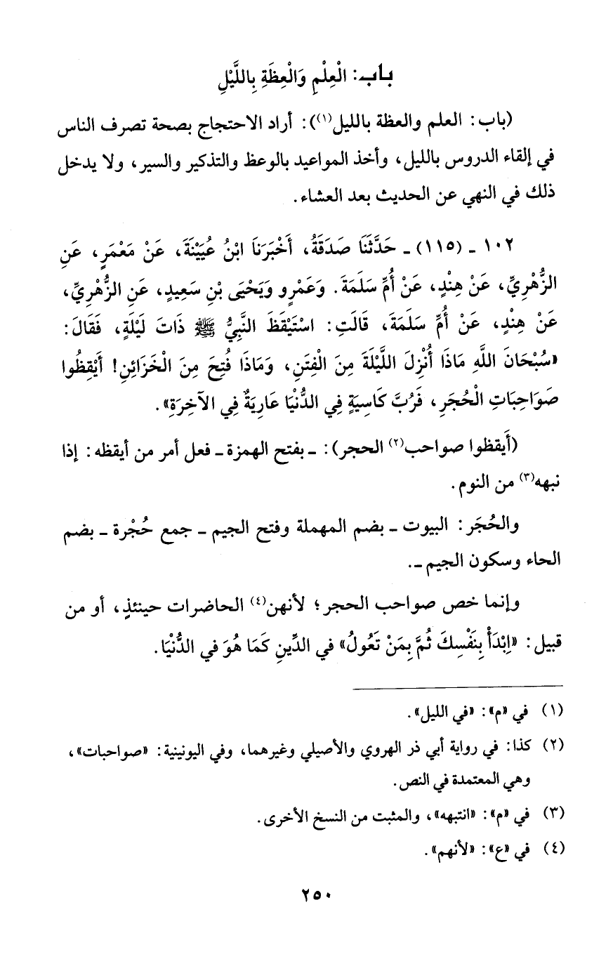 102 - (115) - حَدَّثَنَا صَدَقَةُ، أَخْبَرَنَا ابْنُ عُيَيْنَةَ، عَنْ مَعْمَرٍ، عَنِ الزُّهْرِيِّ، عَنْ هِنْدٍ، عَنْ أُمِّ سَلَمَةَ. وَعَمْرٍو وَيَحْيَى بْنِ سَعِيدٍ، عَنِ الزُّهْرِيِّ، عَنْ هِنْدٍ، عَنْ أُمِّ سَلَمَةَ، قَالَتِ: اسْتَيْقَظَ النَّبِيُّ - صلى الله عليه وسلم - ذَاتَ لَيْلَةٍ، فَقَالَ: "سُبْحَانَ اللَّهِ مَاذَا أُنْزِلَ اللَّيْلَةَ مِنَ الْفِتَنِ، وَمَاذَا فُتِحَ مِنَ الْخَزَائِنِ! أَيْقِظُوا صَوَاحِبَاتِ الْحُجَرِ، فَرُبَّ كَاسِيَةٍ فِي الدُّنْيَا عَارِيَةٌ فِي الآخِرَةِ".