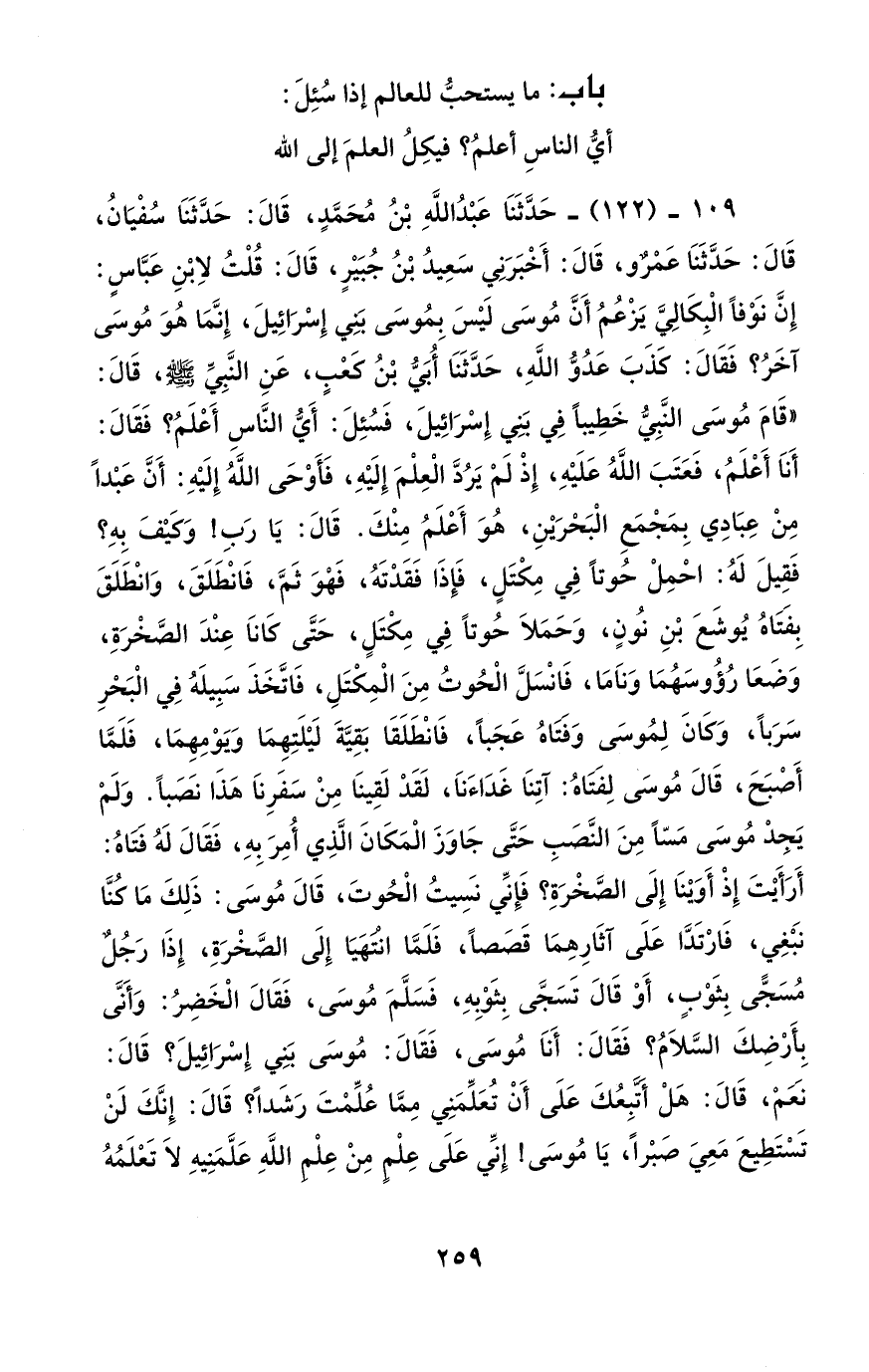 109 - (122) - حَدَّثَنَا عَبْدُ اللَّهِ بْنُ مُحَمَّدٍ، قَالَ: حَدَّثَنَا سُفْيَانُ، قَالَ: حَدَّثَنَا عَمْرٌو، قَالَ: أَخْبَرَنِي سَعِيدُ بْنُ جُبَيْرٍ، قَالَ: قُلْتُ لاِبْنِ عَبَّاسٍ: إِنَّ نَوْفًا الْبِكَالِيَّ يَزْعُمُ أَنَّ مُوسَى لَيْسَ بِمُوسَى بَنِي إِسْرَائِيلَ، إِنَّمَا هُوَ مُوسَى آخَرُ؟ فَقَالَ: كَذَبَ عَدُوُّ اللَّهِ، حَدَّثَنَا أُبَيُّ بْنُ كعْبٍ، عَنِ النَّبِيِّ - صلى الله عليه وسلم -، قَالَ: "قَامَ مُوسَى النَّبِيُّ خَطِيبًا فِي بَنِي إِسْرَائِيلَ، فَسُئِلَ: أَيُّ النَّاسِ أَعْلَمُ؟ فَقَالَ: أَناَ أَعْلَمُ، فَعَتَبَ اللَّهُ عَلَيْهِ، إِذْ لَمْ يَرُدَّ الْعِلْمَ إِلَيْهِ، فَأَوْحَى اللَّهُ إِلَيْهِ: أَنَّ عَبْدًا مِنْ عِبَادِي بِمَجْمَعِ الْبَحْرَيْنِ، هُوَ أَعْلَمُ مِنْكَ. قَالَ: يَا رَبِ! وَكيْفَ بِهِ؟ فَقِيلَ لَهُ: احْمِلْ حُوتًا فِي مِكْتَلٍ، فَإِذَا فَقَدْتَهُ، فَهْوَ ثَمَّ، فَانْطَلَقَ، وَانْطَلَقَ بِفَتَاهُ يُوشَعَ بْنِ نوُنٍ، وَحَمَلاَ حُوتًا فِي مِكْتَلٍ، حَتَّى كاناَ عِنْدَ الصَّخْرَةِ، وَضَعَا رُؤُوسَهُمَا وَنَامَا، فَانْسَلَّ الْحُوتُ مِنَ الْمِكْتَلِ، فَاتَّخَذَ سَبِيلَهُ فِي الْبَحْرِ سَرَبًا، وَكانَ لِمُوسَى وَفَتَاهُ عَجَبًا، فَانْطَلَقَا بَقِيَّةَ لَيْلَتِهِمَا وَيَوْمِهِمَا، فَلَمَّا أَصْبَحَ، قَالَ مُوسَى لِفَتَاهُ: آتِنَا غَدَاءَنَا، لَقَدْ لَقِينَا مِنْ سَفَرِناَ هَذَا نصبًا. وَلَمْ يَجدْ مُوسَى مَسًّا مِنَ النَّصَبِ حَتَّى جَاوَزَ الْمَكَانَ الَّذِي أُمِرَ بِهِ، فَقَالَ لَهُ فتاهُ: أَرَأَيْتَ إِذْ أَوَيْنَا إِلَى الصَّخْرَةِ؟ فَإنِّي نسَيتُ الْحُوتَ، قَالَ مُوسَى: ذَلِكَ مَا كُنَّا نبغِي، فَارْتَدَّا عَلَى آثَارِهِمَا قَصَصًا، فَلَمَّا انتهَيَا إِلَى الصَّخْرَةِ، إِذَا رَجُل مُسَجًّى بِثَوْبٍ، أَوْ قَالَ تَسَجَّى بِثَوْبِهِ، فَسَلَّمَ مُوسَى، فَقَالَ الْخَضِرُ: وَأنَّى بِأَرْضِكَ السَّلاَمُ؟ فَقَالَ: أَناَ مُوسَى، فَقَالَ: مُوسَى بَنِي إِسْرَائِيلَ؟ قَالَ: نعمْ، قَالَ: هَلْ أتَّبِعُكَ عَلَى أَنْ تُعَلِّمَنِي مِمَّا عُلِّمْتَ رَشَدًا؟ قَالَ: إِنَّكَ لَنْ تَسْتَطِيعَ مَعِيَ صَبْرًا، يَا مُوسَى! إِنِّي عَلَى عِلْمٍ مِنْ عِلْم اللَّهِ عَلَّمَنِيهِ لاَ تَعْلَمُهُ