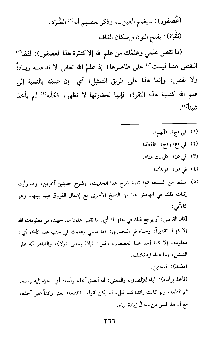 (ما نقص علمي وعلمُك من علم الله إلا كنقرة هذا العصفور): لفظ (¬2) النقص هنا ليست (¬3) على ظاهرها؛ إذ علمُ الله تعالى لا تدخله زيادةٌ ولا نقص، وإنما هذا على طريق التمثيل؛ أي: إن علمَنا بالنسبة إلى علم الله كنسبة هذه النقرة؛ فإنها لحقارتها لا تظهر، فكأنه (¬4) لم يأخذ شيئًا (¬5).
