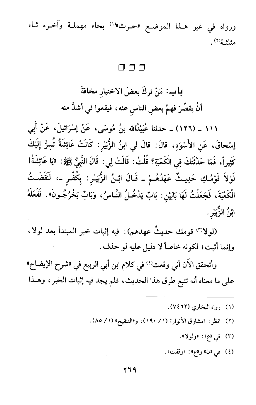 111 - (126) - حدثنا عُبَيْدُ الله بنُ مُوسَى، عَنْ إسْرَائيلَ، عَنْ أَبِي إسْحاقَ، عَنِ الأَسْوَدِ، قالَ: قالَ لي ابنُ الزُّبَيْرِ: كَانَتْ عَائِشَةُ تُسِرُّ إِلَيْكَ كَثِيرًا، فَمَا حَدَّثَتْكَ فِي الْكَعْبةِ؟ قُلْتُ: قَالَتْ لِي: قَالَ النَّبِيُّ - صلى الله عليه وسلم -: "يَا عَائِشَةُ! لَوْلاَ قَوْمُكِ حَدِيثٌ عَهْدُهُمْ -قَالَ ابْنُ الزُّبَيْرِ: بِكُفْرٍ-، لنقَضْتُ الْكَعْبةَ، فَجَعَلْتُ لَهَا بَابَيْنِ: بَابٌ يَدْخُلُ النَّاسُ، وَبَابٌ يَخْرُجُونَ". فَفَعَلَهُ ابْنُ الزُّبَيْرِ.
