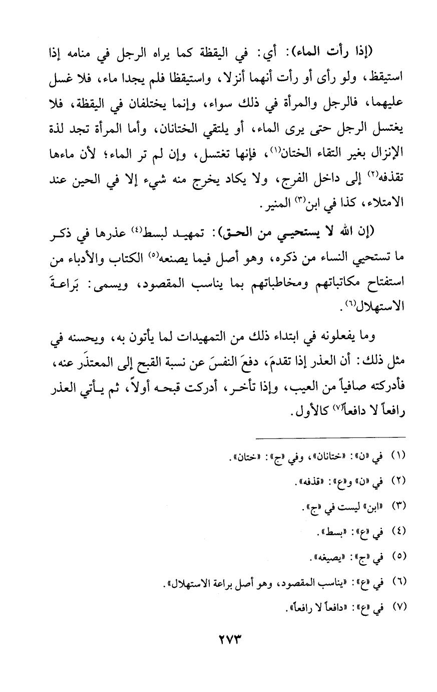 (إن الله لا يستحيي من الحق): تمهيد لبسط (¬4) عذرها في ذكر ما تستحيي النساء من ذكره، وهو أصل فيما يصنعه (¬5) الكتاب والأدباء من استفتاح مكاتباتهم ومخاطباتهم بما يناسب المقصود، ويسمى: بَراعةَ الاستهلال (¬6).