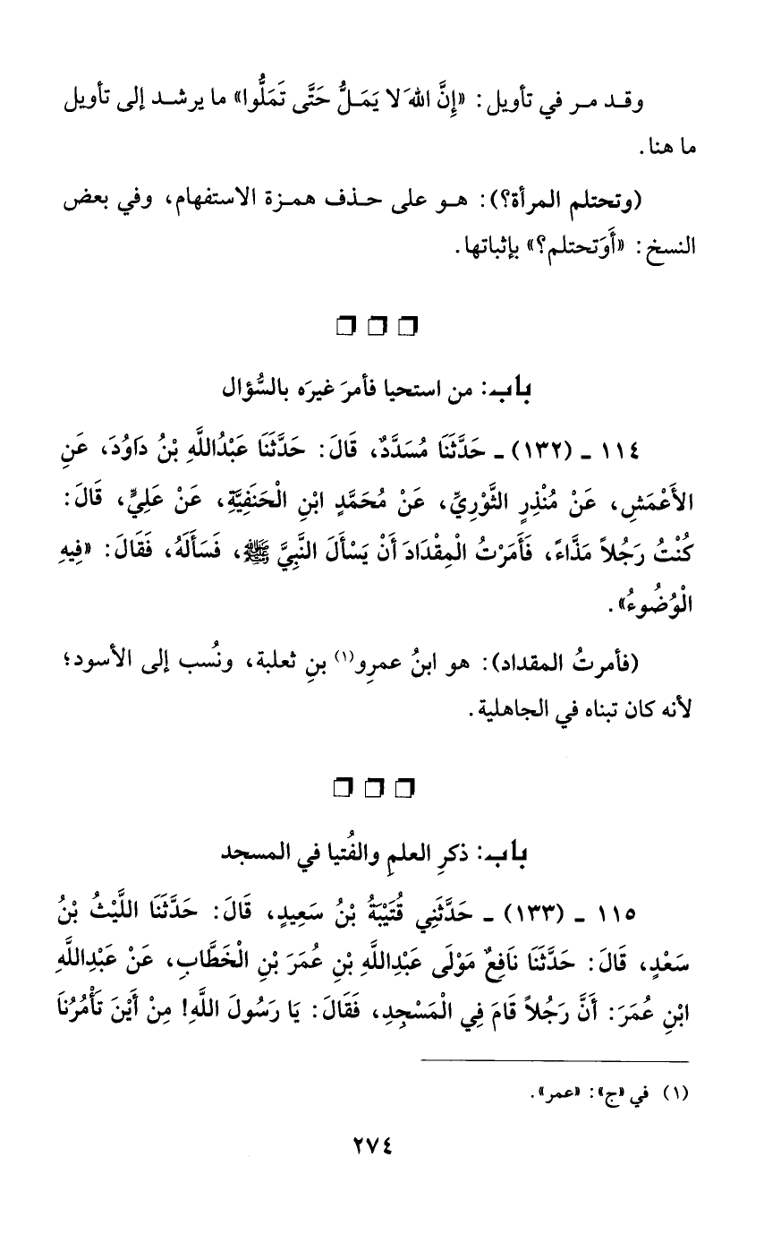 114 - (132) - حَدَّثَنَا مُسَدَّدٌ، قَالَ: حَدَّثَنَا عَبْدُ اللَّهِ بْنُ داوُدَ، عَنِ الأَعْمَشِ، عَنْ مُنْذِرٍ الثَّوْرِيِّ، عَنْ مُحَمَّدٍ ابْنِ الْحَنَفِيَّةِ، عَنْ عَلِيٍّ، قَالَ: كُنْتُ رَجُلًا مَذَّاءً، فَأَمَرْتُ الْمِقْدَادَ أَنْ يَسْأَلَ النبي - صلى الله عليه وسلم -، فَسَأَلَهُ، فَقَالَ: "فِيهِ الْوُضُوءُ".