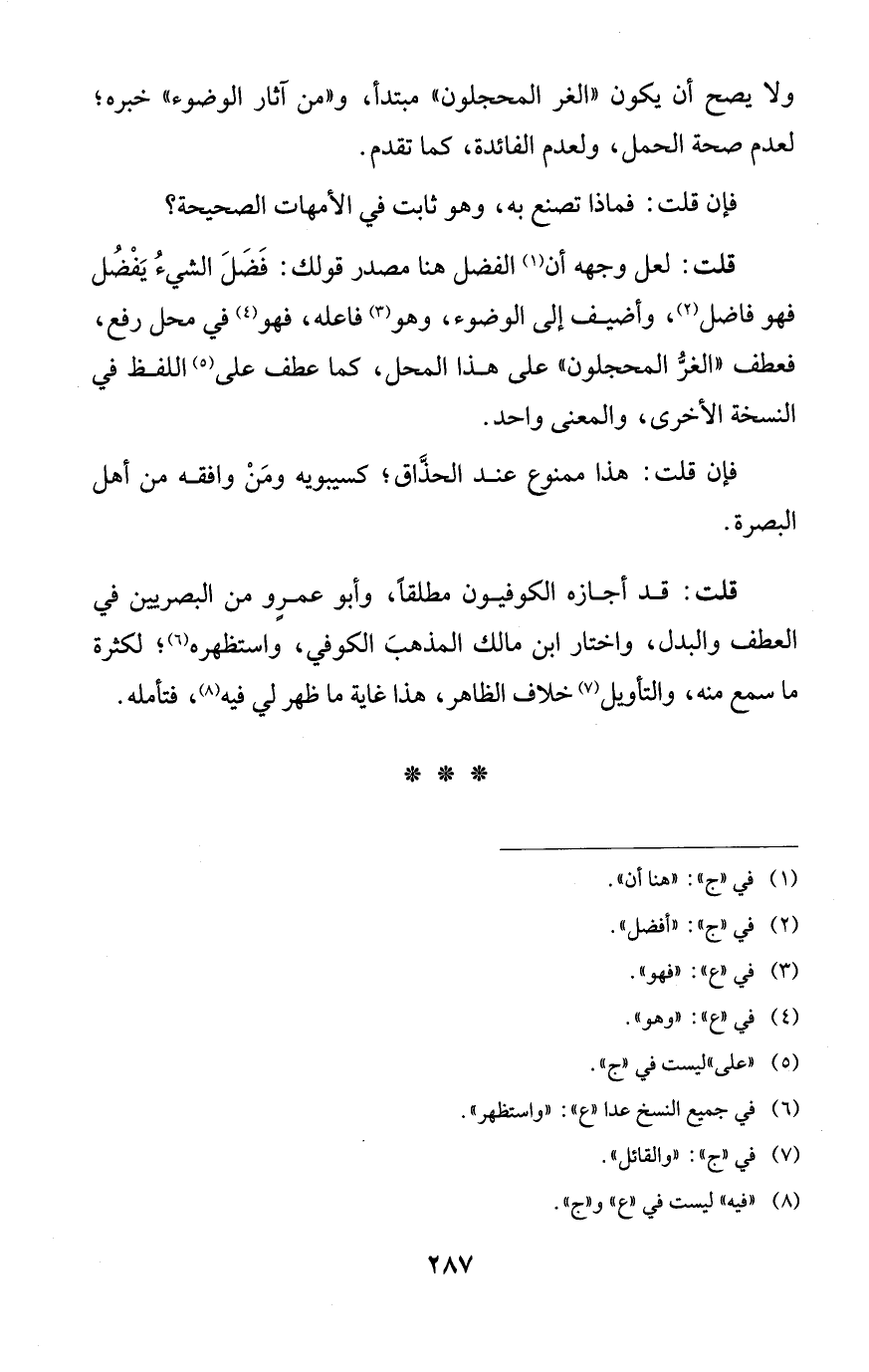 ولا يصح أن يكون "الغر المحجلون" مبتدأ، و"من آثار الوضوء" خبره؛ لعدم صحة الحمل، ولعدم الفائدة، كما تقدم.