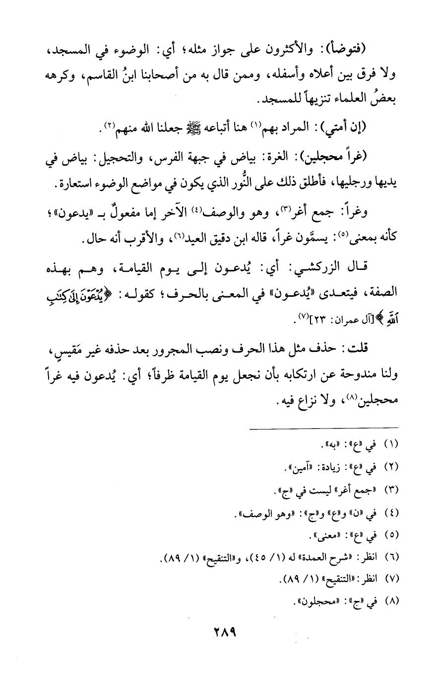 (غرًّا محجلين): الغرة: بياض في جبهة الفرس، والتحجيل: بياض في يديها ورجليها، فأطلق ذلك على النُّور الذي يكون في مواضع الوضوء استعارة.