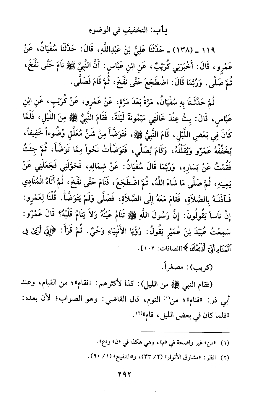 119 - (138) - حَدَّثَنَا عَلِيُّ بْنُ عَبْدِ اللَّهِ، قَالَ: حَدَّثَنَا سُفْيَانُ، عَنْ عَمْرٍو، قَالَ: أَخْبَرَنِي كُرَيْبٌ، عَنِ ابْنِ عَبَّاسٍ: أَنَّ النَّبِيَّ - صلى الله عليه وسلم - ناَمَ حَتَّى نَفَخَ، ثُمَّ صَلَّى. وَرُبَّمَا قَالَ: اضْطَجَعَ حَتَّى نَفَخَ، ثُمَّ قَامَ فَصَلَّى.