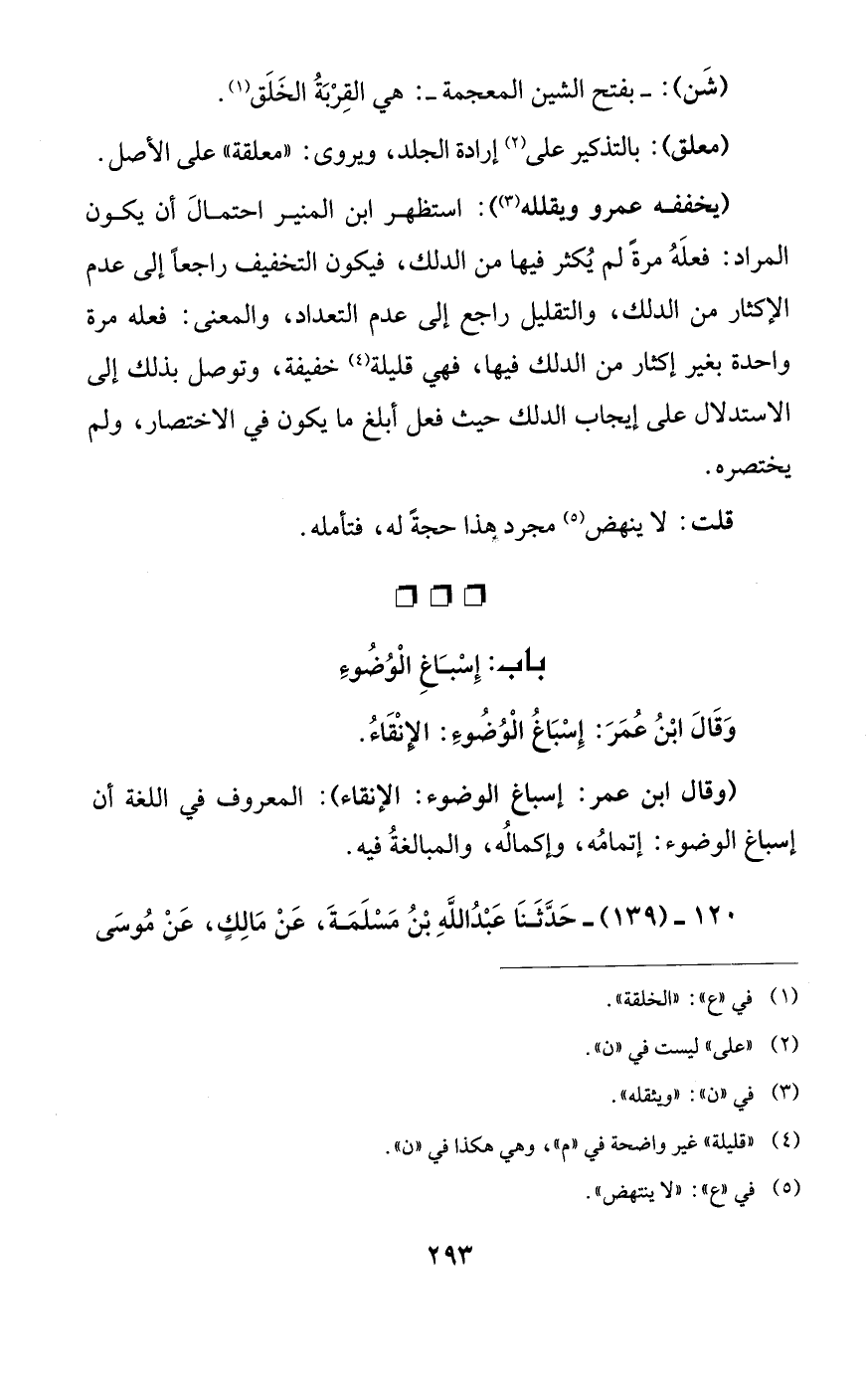 (وقال ابن عمر: إسباغ الوضوء: الإنقاء): المعروف في اللغة أن إسباغ الوضوء: إتمامُه، وإكمالُه، والمبالغةُ فيه.
