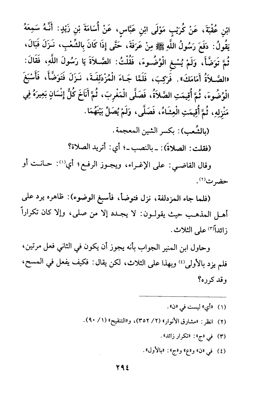 ابْنِ عُقْبةَ، عَنْ كُرَيْبٍ مَوْلَى ابْنِ عَبَّاسٍ، عَنْ أُسَامَةَ بْنِ زيدٍ: أَنَّهُ سَمِعَهُ يَقُولُ: دَفَعَ رَسُولُ اللَّهِ - صلى الله عليه وسلم - مِنْ عَرَفَةَ، حَتَّى إِذَا كَانَ بِالشِّعْبِ، نَزَلَ فَبَالَ، ثم تَوَضَّأَ، وَلَمْ يُسْبغِ الْوُضُوءَ، فَقُلْتُ: الصَّلاَةَ يَا رَسُولَ اللَّهِ، فَقَالَ: "الصَّلاَةُ أَمَامَكَ". فَرَكِبَ، فَلَمَّا جَاءَ الْمُزْدلِفَةَ، نَزَلَ فتوَضَّأَ، فَأَسْبَغ الْوُضُوءَ، ثُمَّ أُقِيمَتِ الصَّلاَةُ، فَصَلَّى الْمَغْرِبَ، ثُمَّ أَناَخَ كُلُّ إنْسَانٍ بَعِيرَهُ فِي مَنْزِلهِ، ثُمَّ أُقِيمَتِ الْعِشَاءُ، فَصَلَّى، وَلَمْ يُصَلِّ بَيْنَهُمَا.