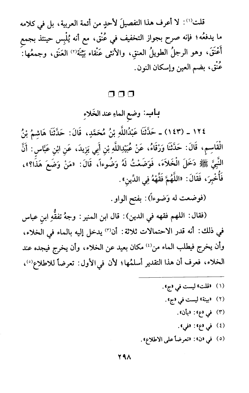 124 - (143) - حَدَّثَنَا عَبْدُ اللَّهِ بْنُ مُحَمَّدٍ، قَالَ: حَدَّثَنَا هَاشِمُ بْنُ الْقَاسِم، قَالَ: حَدَّثَنَا وَرْقَاءُ، عَنْ عُبَيْدِ اللَّهِ بْنِ أَبي يَزِيدَ، عَنِ ابْنِ عَبَّاسٍ: أَنَّ النبي - صلى الله عليه وسلم - دَخَلَ الْخَلاَءَ، فَوَضَعْتُ لَهُ وَضُوءًا، قَالَ: "مَنْ وَضَعَ هَذَا؟ "، فَأُخْبِرَ، فَقَالَ: "اللَّهُمَّ فَقِّهْهُ فِي الدِّينِ".