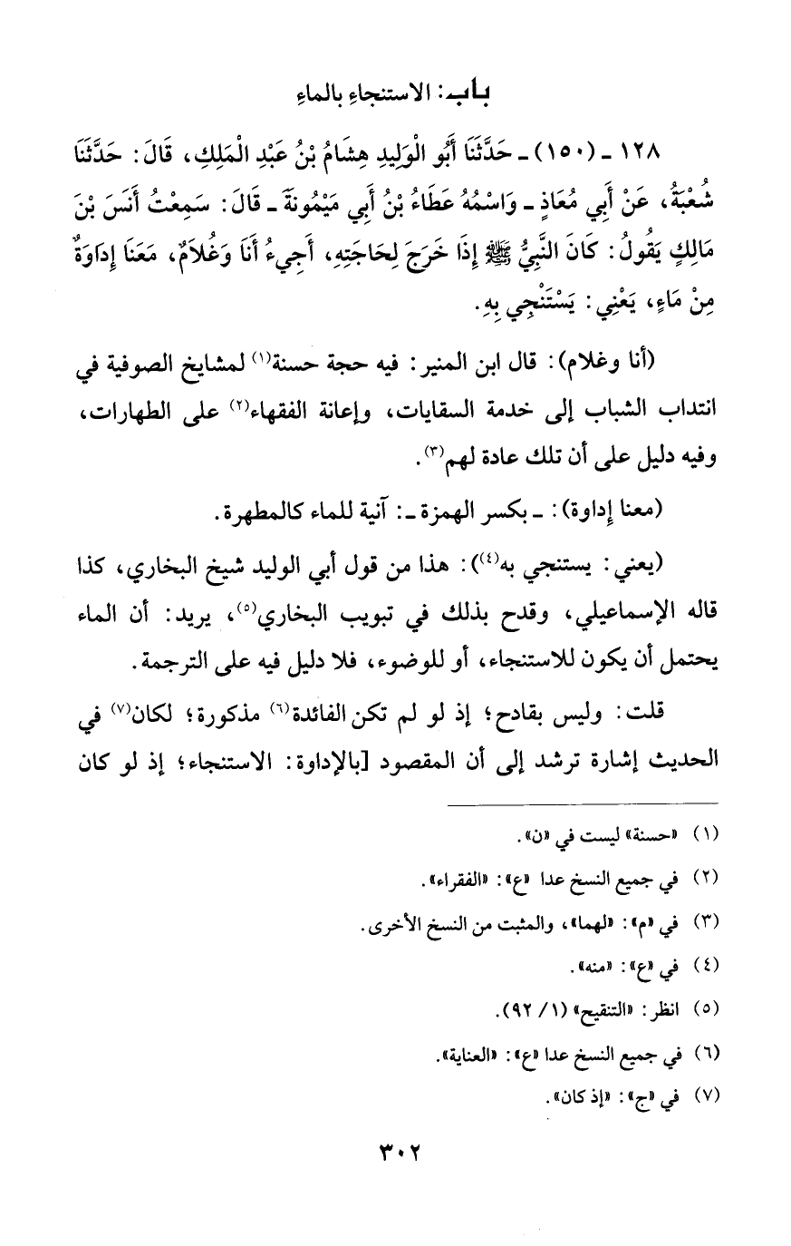 128 - (150) - حَدَّثَنَا أَبُو الْوَليدِ هِشَامُ بْنُ عَبْدِ الْمَلِكِ، قَالَ: حَدَّثَنَا شُعْبةُ، عَنْ أَبي مُعَاذٍ -وَاسْمُهُ عَطَاءُ بْنُ أَبي مَيْمُونة- قَالَ: سَمِعْتُ أَنس بْنَ مَالِكٍ يَقُولُ: كَانَ النَّبِيُّ - صلى الله عليه وسلم - إِذَا خَرَجَ لِحَاجَتِهِ، أَجِيءُ أَناَ وَغُلاَمٌ، مَعَنَا إِداوَةٌ مِنْ مَاءٍ، يَعْنِي: يَسْتَنْجي بِهِ.
