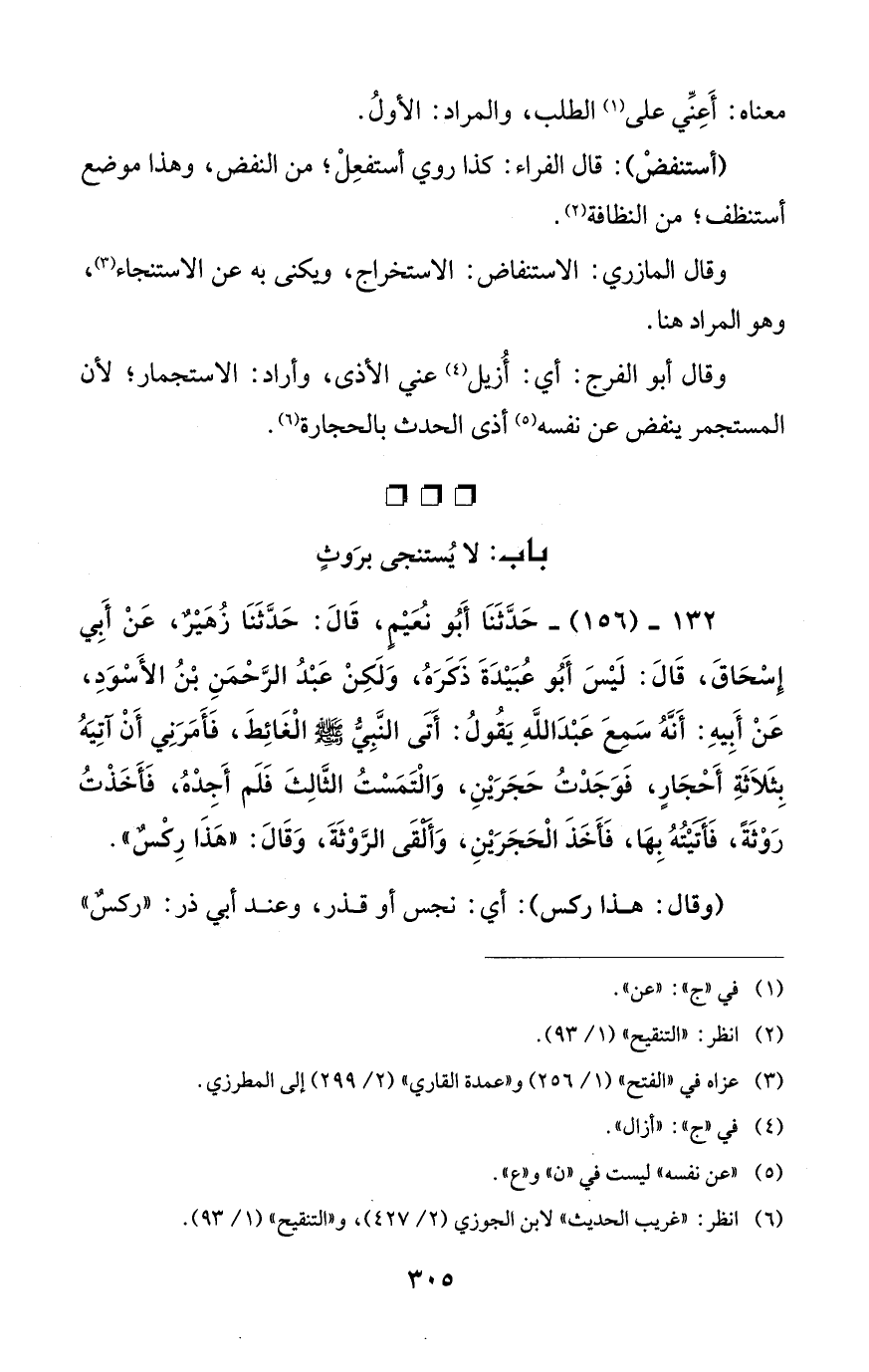 132 - (156) - حَدَّثَنَا أَبُو نُعَيْمٍ، قَالَ: حَدَّثَنَا زُهَيْرٌ، عَنْ أَبِى إسْحَاقَ، قَالَ: لَيْسَ أَبُو عُبَيْدَةَ ذَكَرَهُ، وَلَكِنْ عَبْدُ الرَّحْمَنِ بْنُ الأَسْوَدِ، عَنْ أَبِيهِ: أَنهُ سَمِعَ عَبْدَ اللَّهِ يَقُولُ: أَتَى النبي - صلى الله عليه وسلم - الْغَائِطَ، فَأَمَرَنِي أَنْ آتِيَهُ بِثَلاَثَةِ أَحْجَارٍ، فَوَجَدْتُ حَجَرَيْنِ، وَالْتَمَسْتُ الثَّالِثَ فَلَم أَجِدْهُ، فَأَخَذْتُ رَوْثَةً، فَأتيْتُهُ بِهَا، فَأَخَذَ الْحَجَرَيْنِ، وَألقَى الرَّوْثَةَ، وَقَالَ: "هَذَا رِكْسٌ".