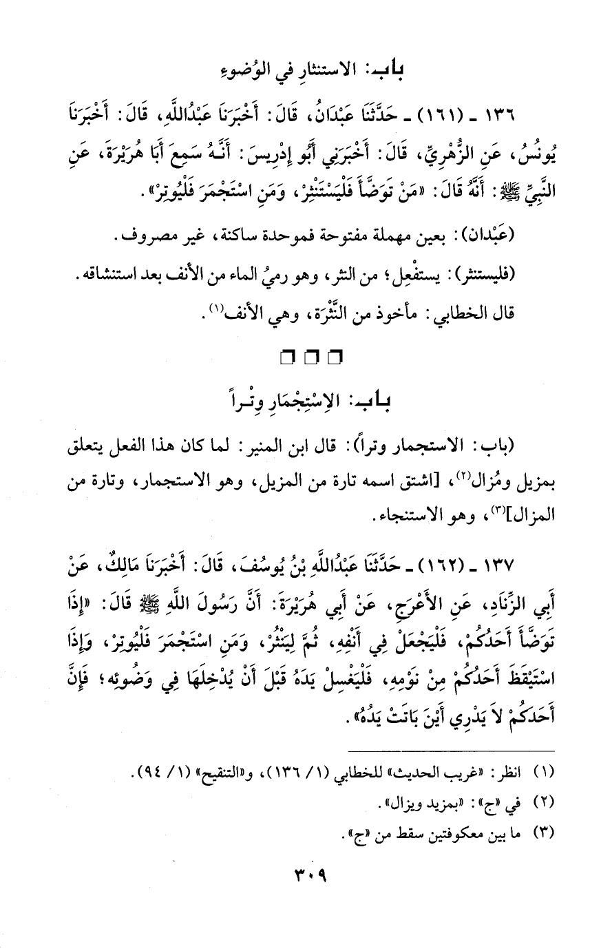 136 - (161) - حَدَّثَنَا عَبْدَانُ، قَالَ: أَخْبَرَنَا عَبدُ اللَّهِ، قَالَ: أَخْبَرَنَا يُونس، عَنِ الزُّهْرِيِّ، قَالَ: أَخْبَرَنِي أَبُو إِدْرِيسَ: أَنَّهُ سَمِعَ أَبَا هُرَيْرَةَ، عَنِ النَّبِيِّ - صلى الله عليه وسلم -: أَنَّهُ قَالَ: "مَنْ تَوَضَّأ فَلْيَسْتَنْثِرْ، وَمَنِ استَجْمَرَ فَلْيُوترْ".
