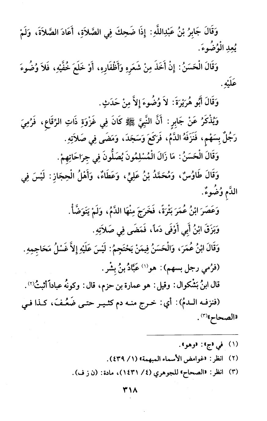 وَيُذْكَرُ عَنْ جَابِرٍ: أَنَّ النَّبِيَّ - صلى الله عليه وسلم - كَانَ فِي غَزْوَةِ ذَاتِ الرِّقَاعِ، فَرُمِيَ رَجُلٌ بِسَهْمِ، فَنَزَفَهُ الدَّمُ، فَرَكعَ وَسَجَدَ، وَمَضَى فِي صَلاَتِهِ.