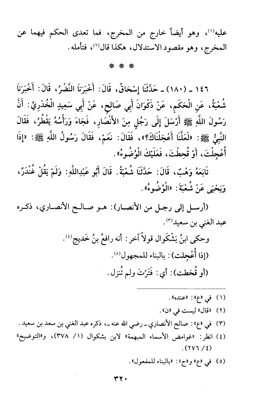 146 - (180) - حَدَّثَنَا إِسْحَاقُ، قَالَ: أَخْبَرَنَا النَّضْرُ، قَالَ: أَخْبَرَنَا شُعْبَةُ، عَنِ الْحَكَم، عَنْ ذَكوَانَ أَبِي صَالح، عَنْ أَبِي سَعِيدٍ الْخُدْرِيِّ: أَنَّ رَسُولَ اللَّهِ - صلى الله عليه وسلم - أَرْسَلَ إِلَى رَجُلٍ مِنَ الأَنْصَارِ، فَجَاءَ وَرَأْسُهُ يَقْطُرُ، فَقَالَ النَّبِيُّ - صلى الله عليه وسلم -: "لَعَلَّنَا أَعْجَلْنَاكَ؟ "، فَقَالَ: نعمْ، فَقَالَ رَسُولُ اللَّهِ - صلى الله عليه وسلم -: "إِذَا أُعْجلْتَ، أَوْ قُحِطْتَ، فَعَلَيْكَ الْوُضُوءُ".