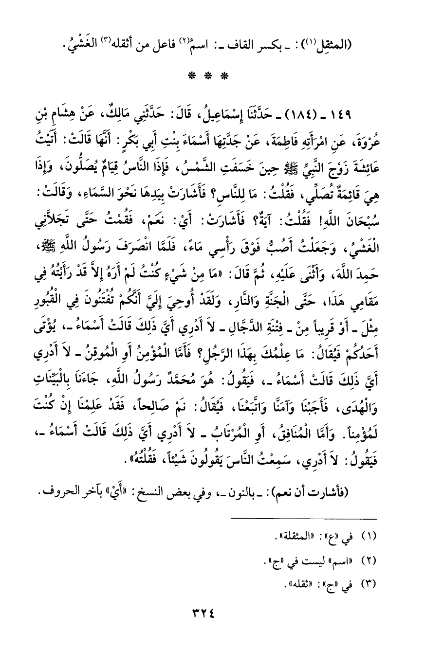 149 - (184) - حَدَّثَنَا إِسْمَاعِيلُ، قَالَ: حَدَّثَنِي مَالِكٌ، عَنْ هِشَامِ بْنِ عُرْوَةَ، عَنِ امْرَأَتِهِ فَاطِمَةَ، عَنْ جَدَّتِهَا أَسْمَاءَ بِنْتِ أَبي بَكْرٍ: أنَّهَا قَالَتْ: أتيْتُ عَائِشَةَ زَوْجَ النَّبِيِّ - صلى الله عليه وسلم - حِينَ خَسَفَتِ الشَّمْسُ، فَإِذَا النَّاسُ قِيَامٌ يُصَلُّونَ، وإذَا هِيَ قَائِمَةٌ تُصَلِّي، فَقُلْتُ: مَا لِلنَّاسِ؟ فَأَشَارَتْ بِيَدِهَا نَحْوَ السَّمَاءِ، وَقَالَتْ: سُبْحَانَ اللَّهِ! فَقُلْتُ: آيَةٌ؟ فَأَشَارَتْ؟ أَيْ: نعَمْ، فَقُمْتُ حَتَّى تَجَلَّانِي الْغَشْيُ، وَجَعَلْتُ أَصُبُّ فَوْقَ رَأْسِي مَاءً، فَلَمَّا انْصَرَفَ رَسُولُ اللَّهِ - صلى الله عليه وسلم -، حَمِدَ اللَّهَ، وَأثنَى عَلَيْهِ، ثُمَّ قَالَ: "مَا مِنْ شَيْءٍ كُنْتُ لَمْ أَرَهُ إِلَّا قَدْ رَأَيْتُهُ فِي مَقَامِي هَذَا، حَتَّى الْجَنَّةِ وَالنَّارِ، وَلَقَدْ أُوحِيَ إِلَيَّ أَنَكمْ تُفْتَنُونَ فِي الْقُبُورِ مِثْلَ -أَوْ قَرِيبًا مِنْ- فِتْنَةِ الدجَّالِ -لاَ أَدْرِي أَيَّ ذَلِكَ قَالَتْ أَسْمَاءُ-، يُؤْتَى أَحَدُكُمْ فَيُقَالُ: مَا عِلْمُكَ بِهَذَا الرَّجُلِ؟ فَأَمَّا الْمُؤْمِنُ أَوِ الْمُوقِنُ -لاَ أَدْرِي أَيَّ ذَلِكَ قَالَتْ أَسْمَاءُ-، فَيَقُولُ: هُوَ مُحَمَّدٌ رَسُولُ اللَّهِ، جَاءَناَ بِالْبيِّنَاتِ وَالْهُدَى، فَأَجَبْنَا وَآمَنَّا وَاتَّبَعْنَا، فَيُقَالُ: نمْ صَالِحًا، فَقَدْ عَلِمْنَا إِنْ كنْتَ لَمُؤْمِنًا. وَأَمَّا الْمُنَافِقُ، أَوِ الْمُرْتَابُ -لاَ أَدْرِي أَيَّ ذَلِكَ قَالَتْ أَسْمَاءُ-، فَيقُولُ: لاَ أَدْرِي، سَمِعْتُ النَّاسَ يَقُولُونَ شَيْئًا، فَقُلْتُهُ".