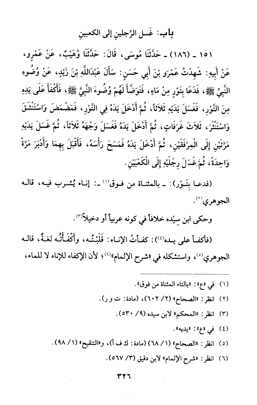 151 - (186) - حَدَّثَنَا مُوسَى، قَالَ: حَدَّثَنَا وُهَيْب، عَنْ عَمْرٍو، عَنْ أبِيهِ: شَهِدْتُ عَمْرَو بْنَ أَبي حَسَنٍ: سَأَلَ عَبْدَ اللَّهِ بْنَ زيدٍ، عَنْ وُضُوءِ النَّبِيِّ - صلى الله عليه وسلم -، فَدَعَا بِتَوْرٍ مِنْ مَاءٍ، فَتَوَضَّأَ لَهُمْ وُضُوءَ النَّبِيِّ - صلى الله عليه وسلم -، فَأكفَأَ عَلَى يَدِهِ مِنَ التَّوْرِ، فَغَسَلَ يَدَيْهِ ثَلاَثًا، ثُمَّ أَدْخَلَ يَدَهُ فِي التَّوْرِ، فَمَضْمَض وَاسْتَنْشَقَ وَاسْتَنْثَرَ، ثَلاَثَ غَرَفَاتٍ، ثُمَّ أَدْخَلَ يَدَهُ فَغَسَلَ وَجْهَهُ ثَلاَثًا، ثُمَّ غَسَلَ يَدَيْهِ مَرَّتَيْنِ إِلَى الْمِرْفَقَيْنِ، ثُمَّ أَدْخَلَ يَدَهُ فَمَسَحَ رَأْسَهُ، فَأَقْبَلَ بِهِمَا وَأَدْبَرَ مَرَّةً وَاحِدَةً، ثُمَّ غَسلَ رِجْلَيْهِ إِلَى الْكَعْبَيْنِ.