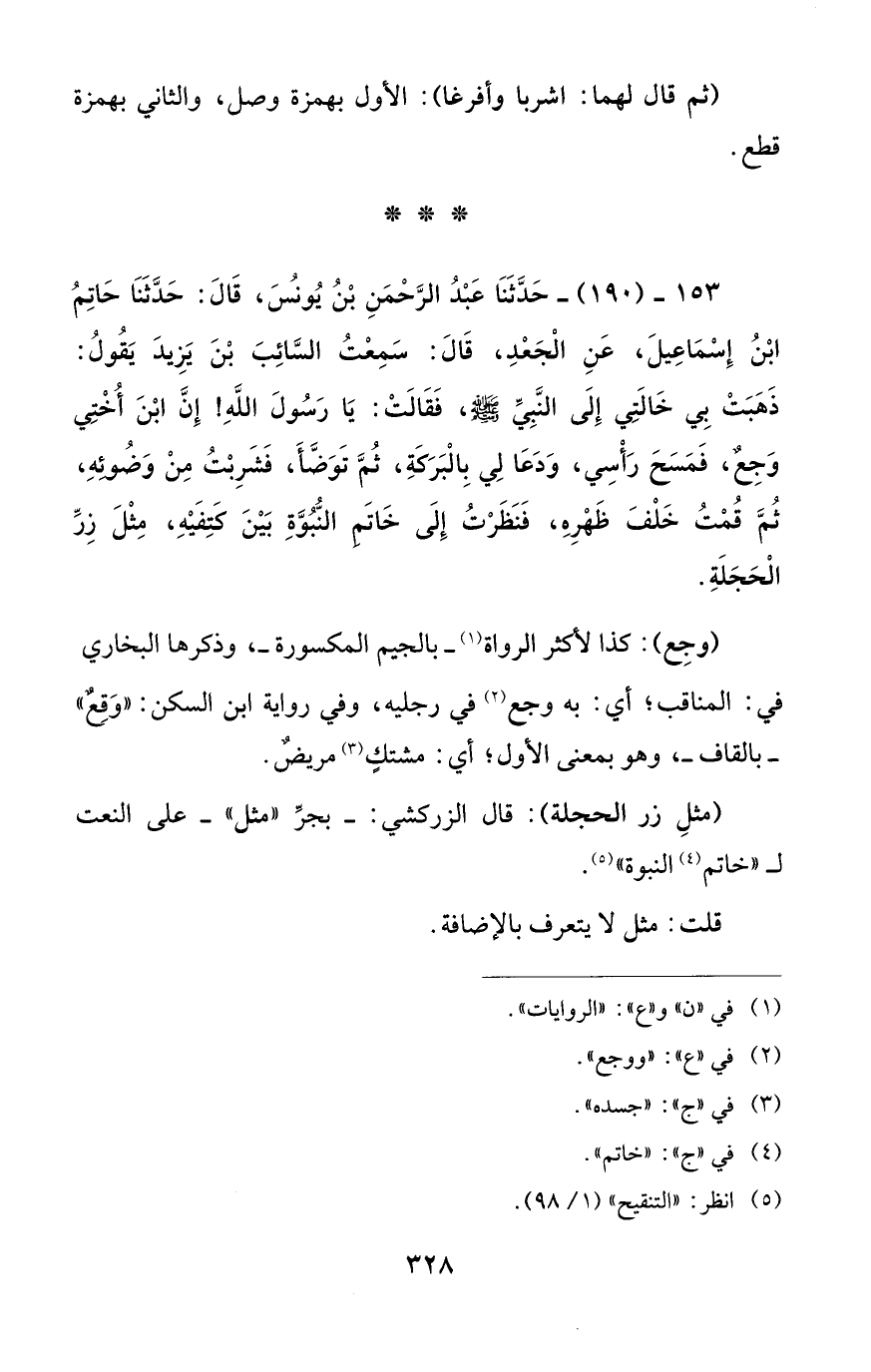 153 - (190) - حَدَّثَنَا عَبْدُ الرَّحْمَنِ بْنُ يُونسَ، قَالَ: حَدَّثَنَا حَاتِمُ ابْنُ إِسْمَاعِيلَ، عَنِ الْجَعْدِ، قَالَ: سَمِعْتُ السَّائِبَ بْنَ يَزِيدَ يَقُولُ: ذَهَبَتْ بِي خَالَتِي إِلَى النَّبِيِّ - صلى الله عليه وسلم -، فَقَالَتْ: يَا رَسُولَ اللَّهِ! إِنَّ ابْنَ أختِي وَجِعٌ، فَمَسَحَ رَأْسِي، وَدَعَا لِي بِالْبَرَكَةِ، ثُمَّ تَوَضَّأَ، فَشَرِبْتُ مِنْ وَضُؤئهِ، ثُمَّ قُمْتُ خَلْفَ ظَهْرِهِ، فَنَظَرْتُ إِلَى خَاتَم النُّبُوَّةِ بَيْنَ كَتِفَيْهِ، مِثْلَ زِرِّ الْحَجَلَةِ.
