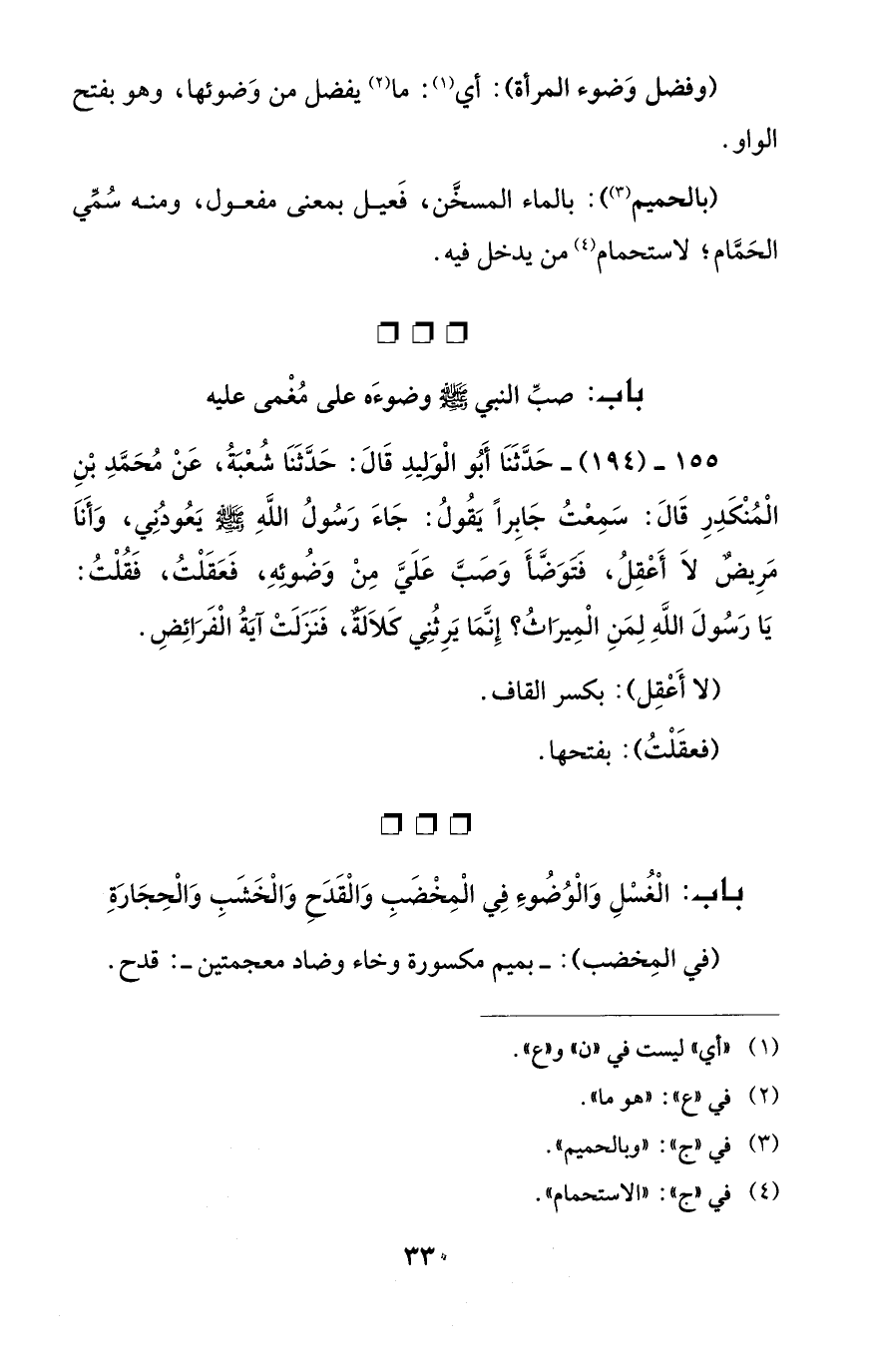 155 - (194) - حَدَّثَنَا أَبُو الْوَليدِ قَالَ: حَدَّثَنَا شُعْبَةُ، عَنْ مُحَمَّدِ بْنِ الْمُنْكَدِرِ قَالَ: سَمِعْتُ جَابِرًا يَقُولُ: جَاءَ رَسُولُ اللَّهِ - صلى الله عليه وسلم - يَعُودُنِي، وَأَناَ مَرِيضٌ لا أَعْقِلُ، فتوَضَّأَ وَصَبَّ عَلَيَّ مِنْ وَضُوئهِ، فَعَقَلْتُ، فَقُلْتُ: يَا رَسُولَ اللَّهِ لِمَنِ الْمِيرَاثُ؟ إِنَّمَا يَرِثُنِي كَلاَلةٌ، فَنَزَلَتْ آيَةُ الْفَرَائِضِ.