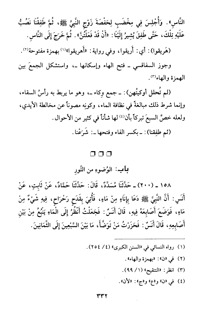 158 - (200) - حَدَّثَنَا مُسَدَّدٌ، قَالَ: حَدَّثَنَا حَمَّادٌ، عَنْ ثَابِتٍ، عَنْ أَنس: أَنَّ النَّبِيَّ - صلى الله عليه وسلم - دَعَا بِإِنَاءٍ مِنْ مَاءٍ، فَأُتِيَ بِقَدح رَحْرَاحٍ، فِيهِ شَيْءٌ مِنْ مَاءٍ، فَوَضَعَ أَصَابِعَهُ فِيهِ، قَالَ أَنسٌ: فَجَعَلْتُ أَنْظُرُ إِلَى الْمَاءَ يَنْبُعُ مِنْ بَيْنِ أَصَابِعِهِ، قَالَ أَنسٌ: فَحَزَرْتُ مَنْ تَوَضَّأَ، مَا بَيْنَ السَّبْعِينَ إِلَى الثَّمَانِينَ.
