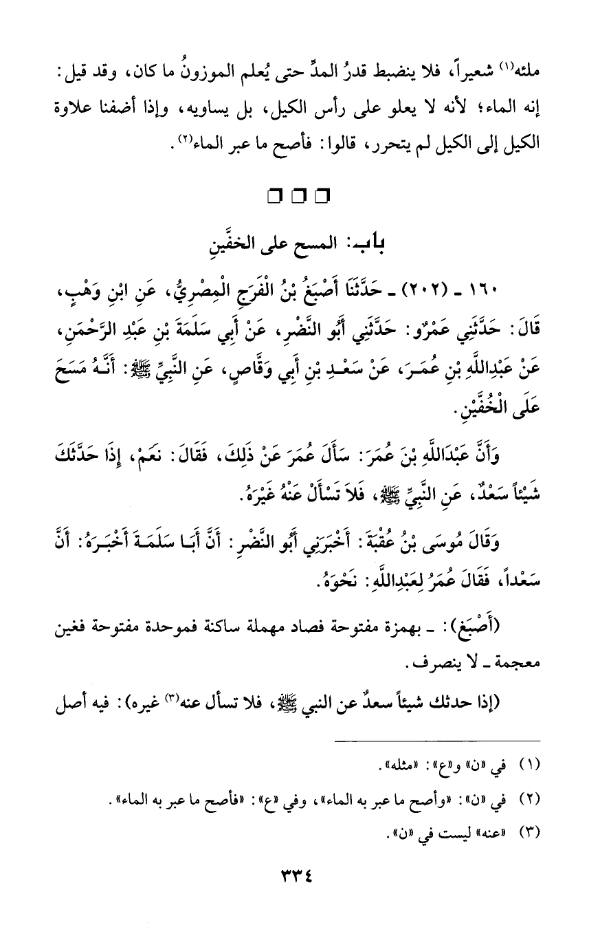 165 - (252) - حَدَّثَنَا أَصْبَغُ بْنُ الْفَرَجِ الْمِصْرِيُّ، عَنِ ابْنِ وَهْبٍ، قَالَ: حَدَّثَنِي عَمْرو: حَدَّثَنِي أبو النَّضْرِ، عَنْ أَبي سَلَمَةَ بْنِ عَبْدِ الرَّحْمَنِ، عَنْ عَبْدِ اللَّهِ بْنِ عُمَرَ، عَنْ سَعْدِ بْنِ أَبِي وَقَّاصٍ، عَنِ النَّبِيِّ - صلى الله عليه وسلم -: أَنَّهُ مَسَحَ عَلَى الْخُفَّيْنِ.