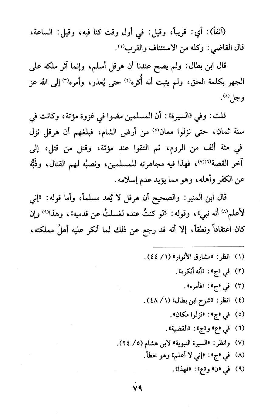 قال ابن المنير: والصحيح أن هرقل لا يُعد مسلمًا، وأما قوله: "إني لأعلم (¬8) أنه نبي"، وقوله: "لو كنتُ عنده لغسلتُ عن قدميه"، وهذا (¬9) وإن كان اعتقادًا ونطقًا، إلا أنه قد رجع عن ذلك لما أنكر عليه أهلُ مملكته،