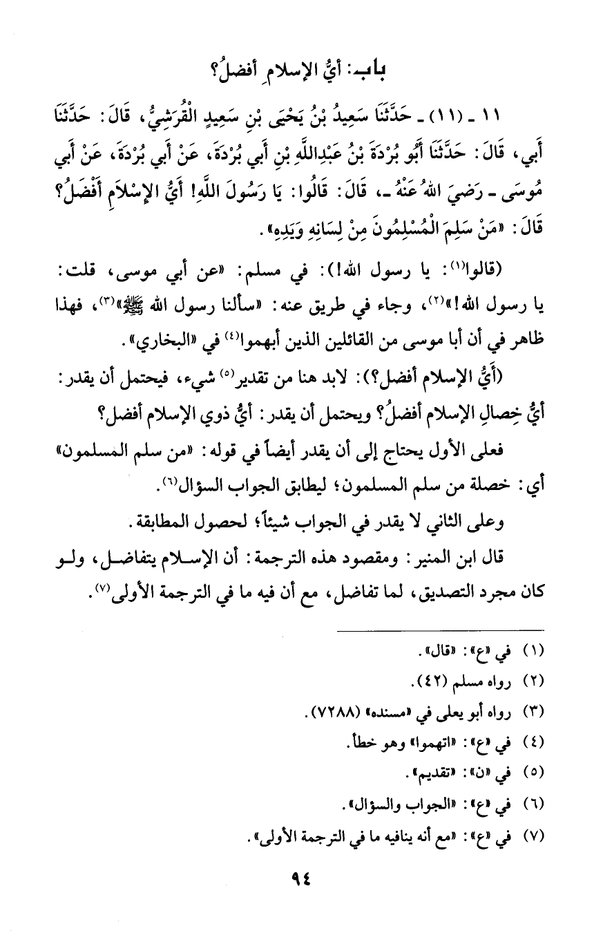 11 - (11) - حَدَّثَنَا سَعِيدُ بْنُ يَحْيَى بْنِ سَعِيدٍ الْقُرَشِيُّ، قَالَ: حَدَّثَنَا أَبي، قَالَ: حَدَّثَنَا أَبُو بُرْدَةَ بْنُ عَبْدِ اللهِ بْنِ أَبي بُرْدَةَ، عَنْ أَبي بُرْدَةَ، عَنْ أبي مُوسَى -رَضيَ اللهُ عَنْهُ-، قَالَ: قَالُوا: يَا رَسُولَ الله! أَيُّ الإسْلاَمِ أَفْضَلُ؟ قَالَ: "مَنْ سَلِمَ الْمُسْلِمُونَ مِنْ لِسَانِهِ وَيَده".