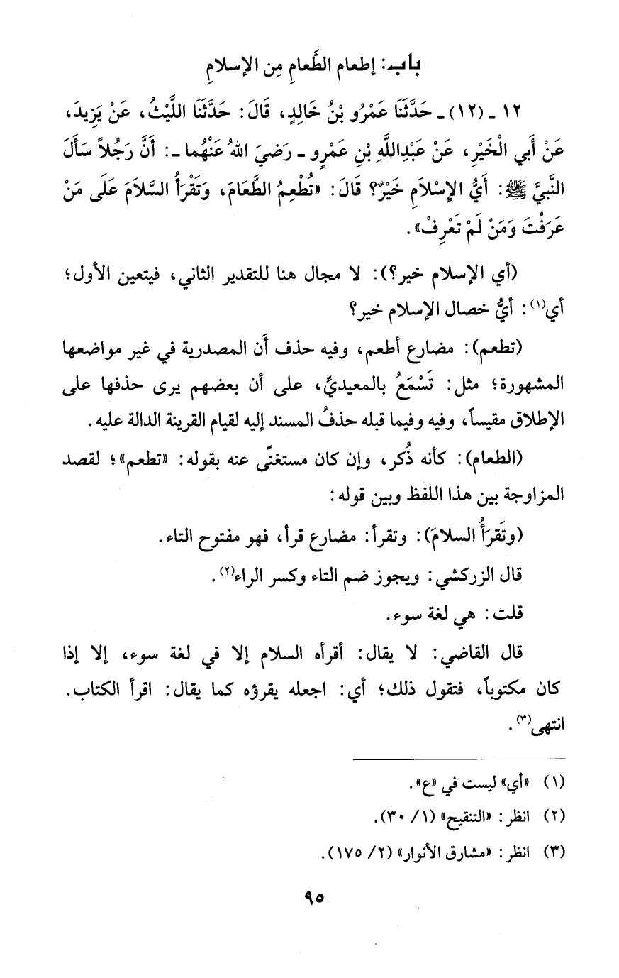 12 - (12) - حَدَّثَنَا عَمْرُو بْنُ خَالِدٍ، قَالَ: حَدَّثَنَا اللَّيْثُ، عَنْ يَزِيدَ، عَنْ أَبي الْخَيْرِ، عَنْ عَبْدِ اللَّهِ بنِ عَمْرٍو -رَضِيَ اللهُ عَنْهُما-: أَنَّ رَجُلًا سَأَلَ النَّبيَّ - صلى الله عليه وسلم -: أَيُّ الإسْلاَمِ خَيْرٌ؟ قَالَ: "تُطْعِمُ الطَّعَامَ، وَتَقْرَأُ السَّلاَمَ عَلَى مَنْ عَرَفْتَ وَمَنْ لَمْ تَعْرِفْ".