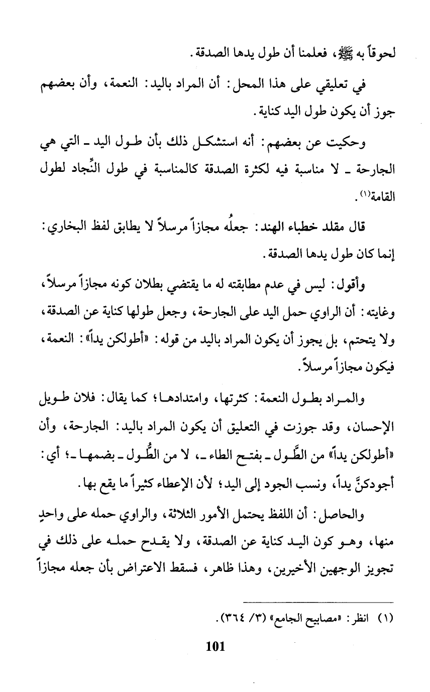 قال مقلد خطباء الهند: جعلُه مجازًا مرسلًا لا يطابق لفظ البخاري: إنما كان طول يدها الصدقة.